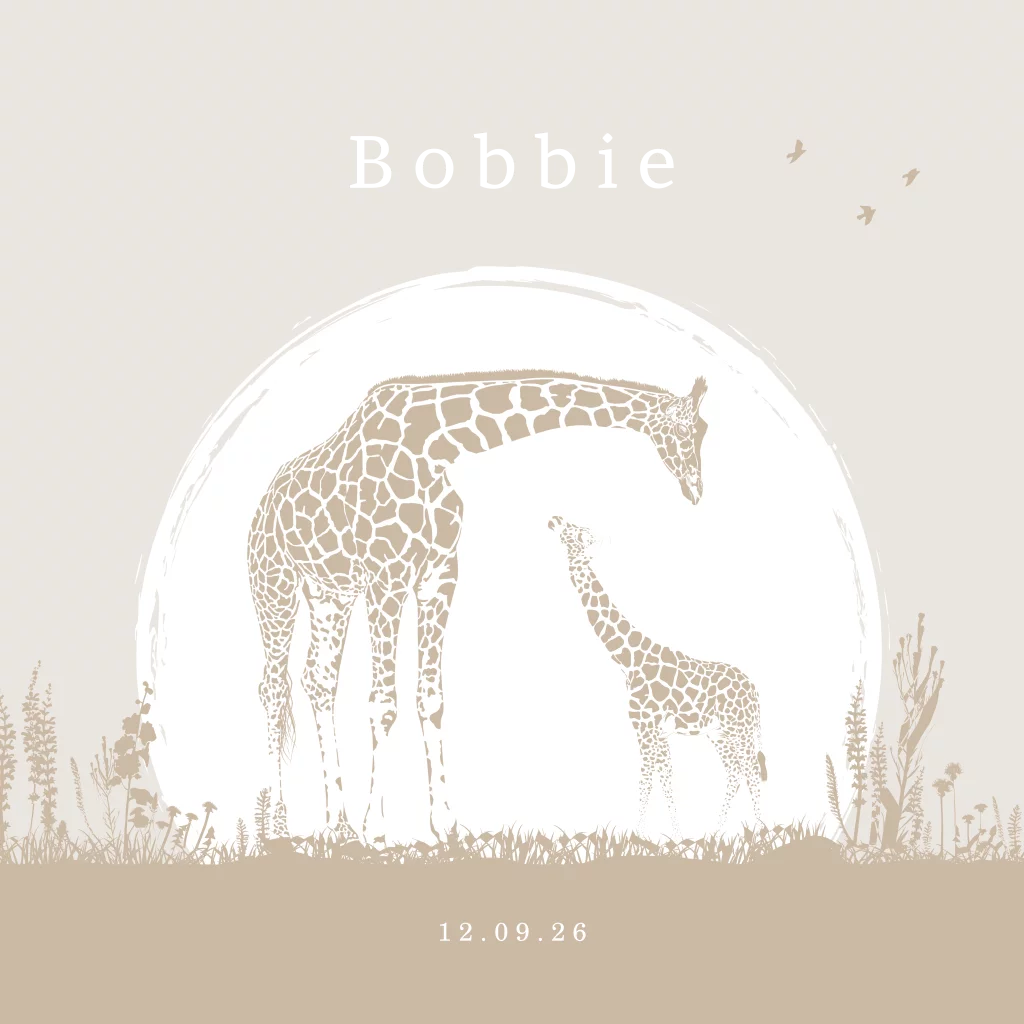 Stijlvol geboortekaartje in aardetinten met giraffen en goudfolie