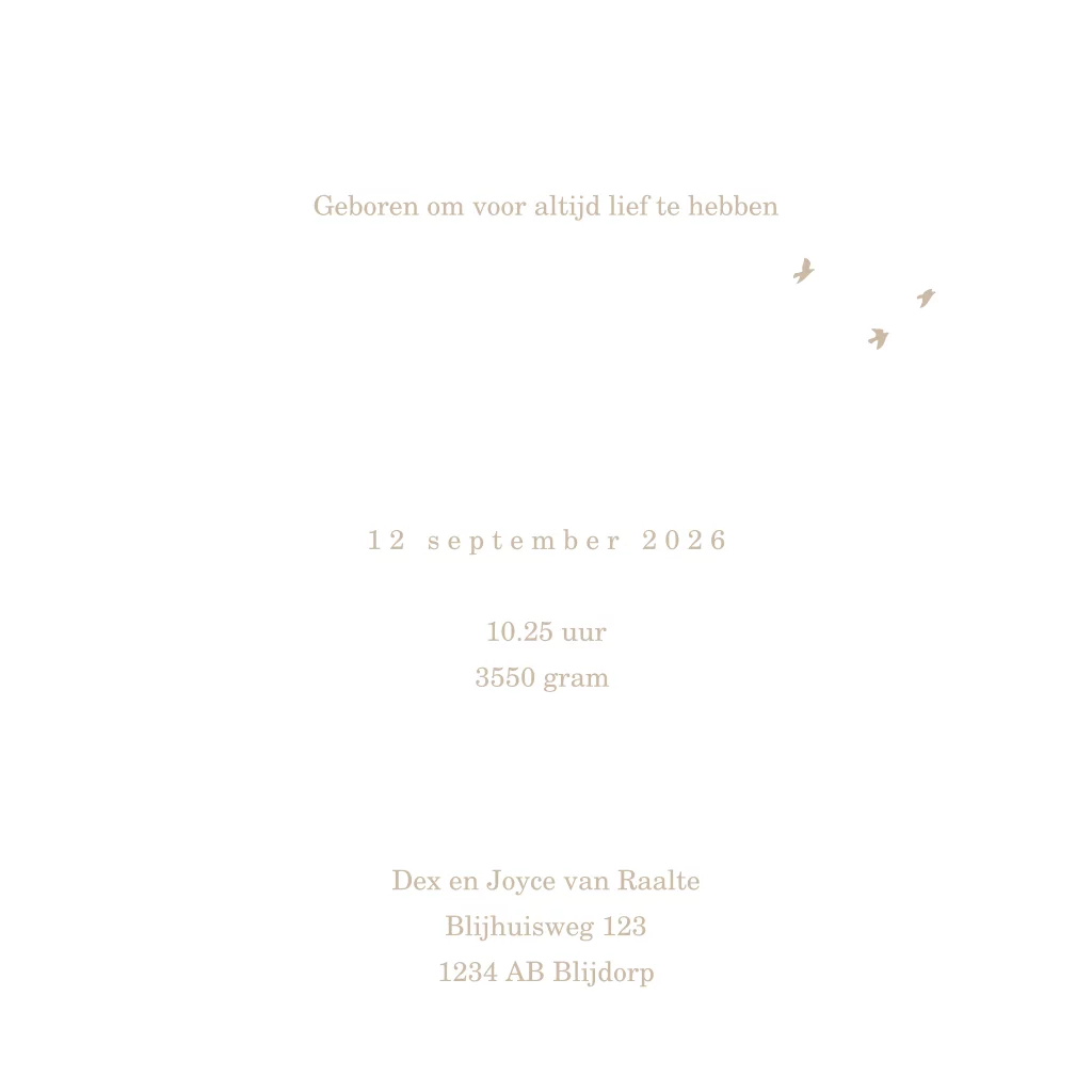 Een trendy geboortekaartje met prachtige aardetinten. Op het kaartje zie je twee giraffen en vogeltjes. De naam is gedrukt in goudfolie en laat het kaartje echt schitteren.