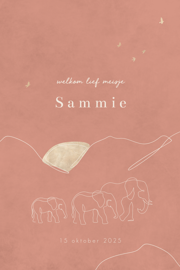 Op dit stoere geboortekaartje staat de tekening van drie olifanten, bergen en een ondergaande zon. De vogeltjes in de lucht maken dit kaartje compleet. Bestel een proefdrukje om het kaartje thuis te bekijken!