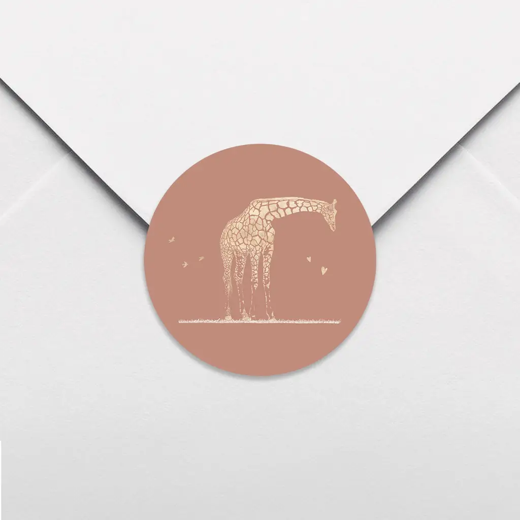 Stijlvolle sluitsticker met giraffe en hartjes. Deze sticker is passend bij het geboortekaartje van designer Blijkaartje. Pas de sticker naar wens aan in onze online editor. De sluitstickers hebben een diameter van 35 mm en worden geleverd op vellen van 25 stuks.