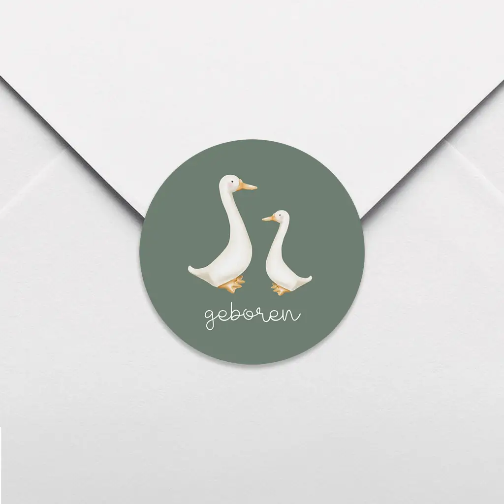 Een lieve sluitsticker die bijpassend is bij het geboortekaartje van onze designer Blijkaartje. Op de sluitsticker zie je twee gansjes op een groene achtergrond. Pas de sluitsticker naar wens aan in onze online editor. De sluitstickers hebben een diameter van 35 mm en worden geleverd op vellen van 25 stuks.