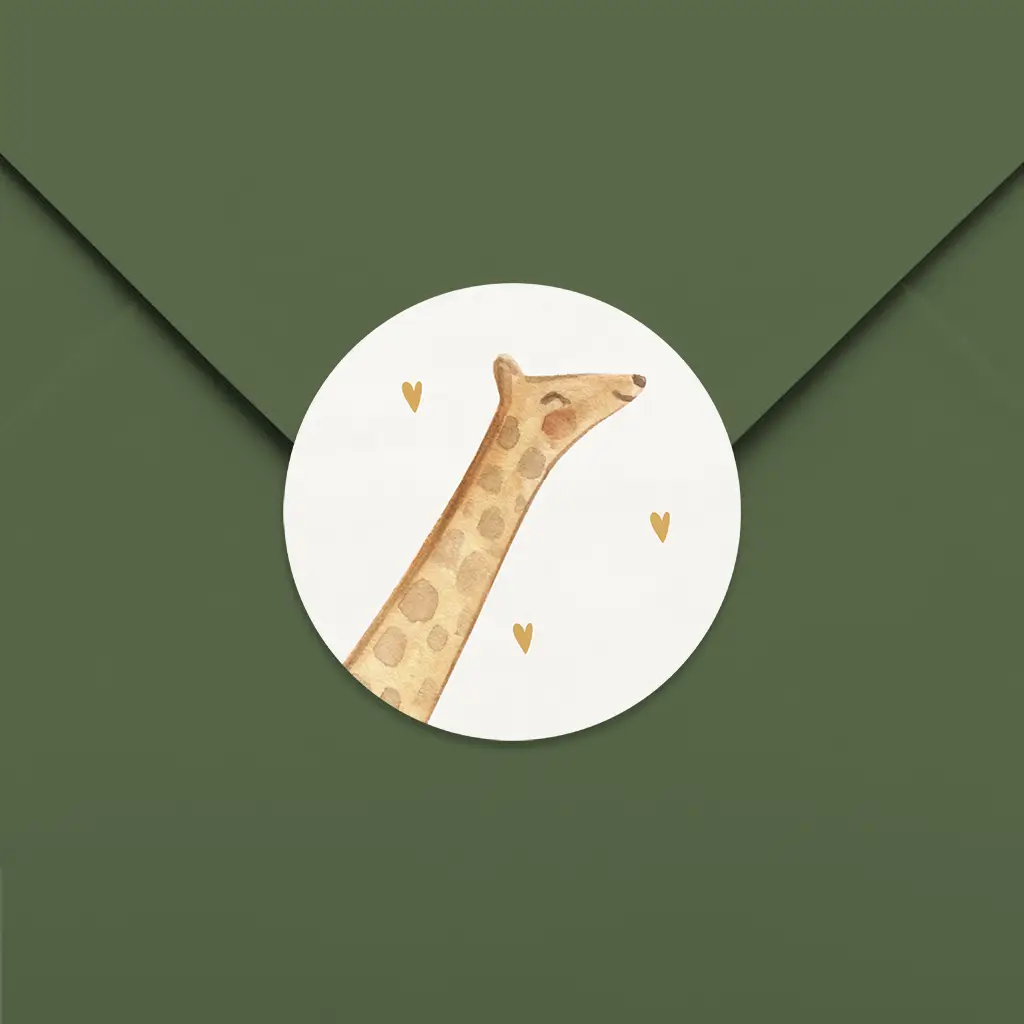 Een schattige sluitsticker met leuke illustratie van een giraffe omringd door hartjes. Deze sticker past perfect bij het geboortekaartje van designer Blijkaartje. De sluitstickers hebben een diameter van 35 mm en worden geleverd op vellen van 25 stuks.