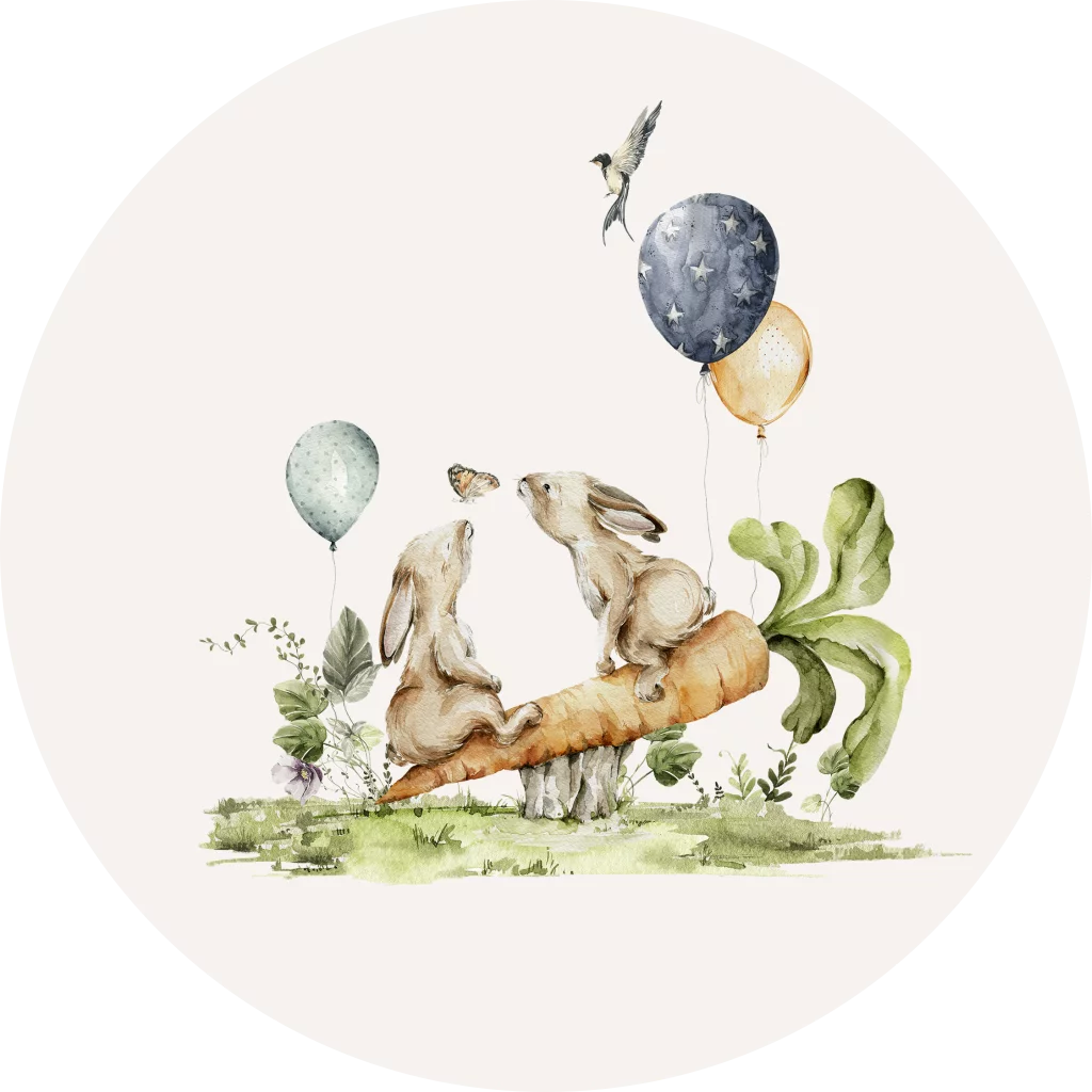 Een stijlvolle sluitsticker passend bij het geboortekaartje voor jouw kindje. De sticker heeft prachtige watercolour illustraties. Je ziet twee konijntjes en verschillende ballonnetjes. Pas het ontwerp naar wens aan in onze online editor.