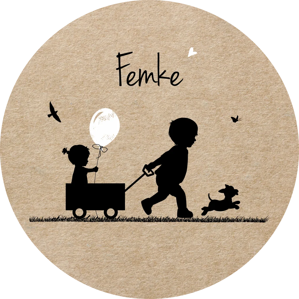 Een sluitsticker met kraftlook achtergrond. Je ziet twee silhouetjes van een grote broer met zijn kleinere zusje. De sticker is volledig te personaliseren in onze editor.