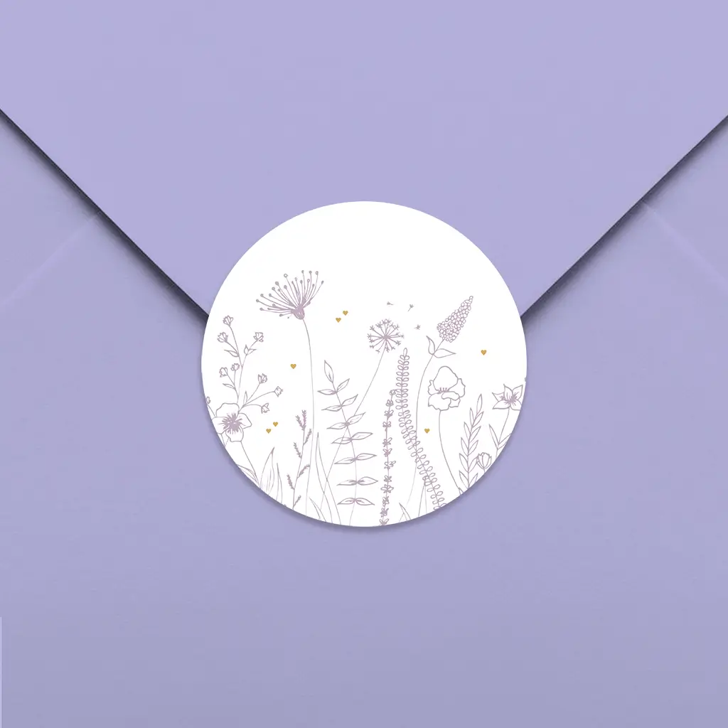 Op deze sluitsticker staan lijntekeningen van paarse bloemen. De kleine goudkleurige hartjes geven deze sluitsticker een lieve uitstraling. De sluitsticker past bij het bijbehorende kaartje van Blijkaartje. Personaliseer de sluitsticker in onze online editor. De sluitstickers hebben een diameter van 35 mm en worden geleverd op vellen van 25 stuks.