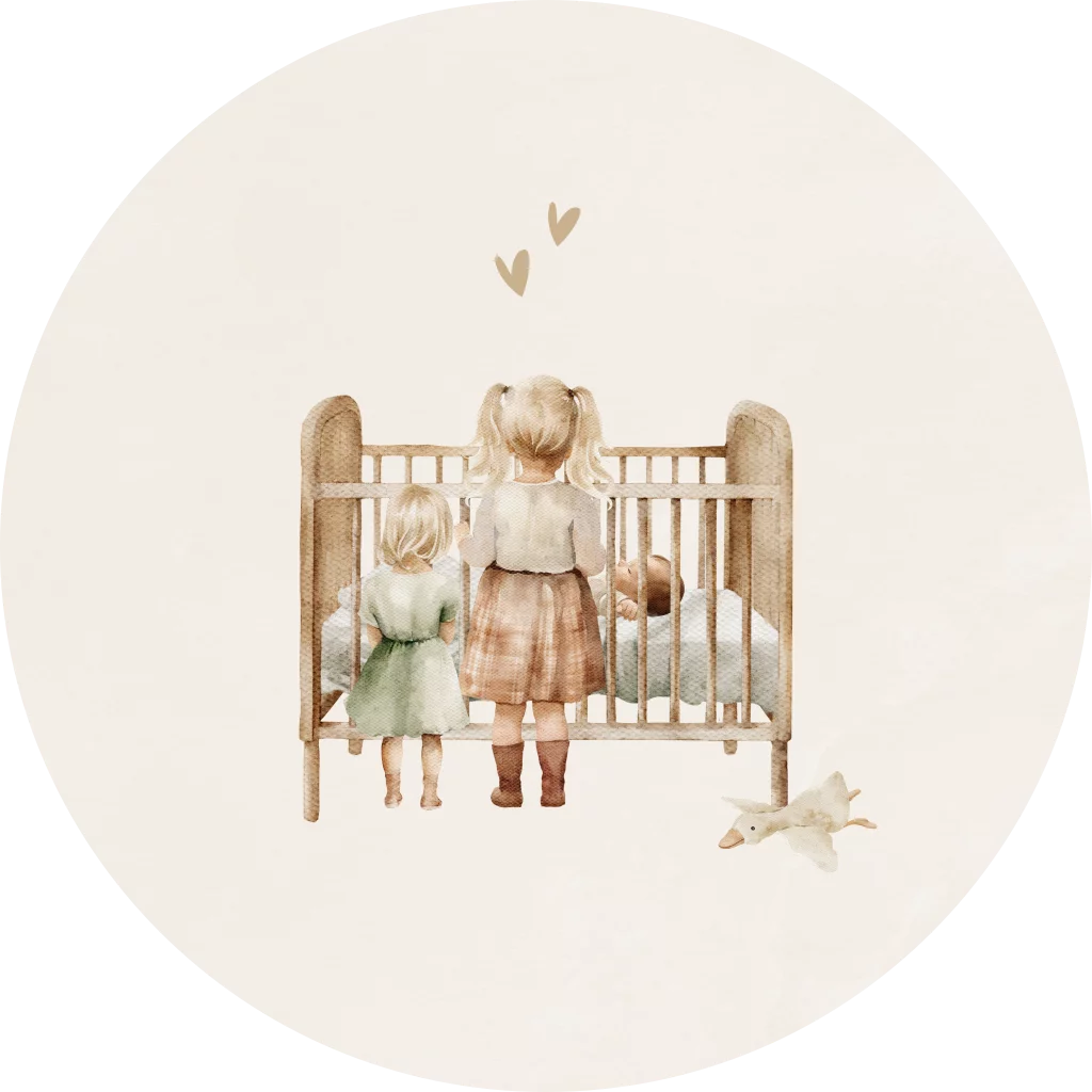 Lieve sluitsticker voor bij het geboortekaartje. De sticker heeft zachte kleuren en prachtige illustraties van grote zussen bij het ledikantje van hun nieuwe broertje of zusje. De sticker is te personaliseren in onze online editor. De sluitstickers hebben een diameter van 35 mm en worden geleverd op vellen van 25 stuks.