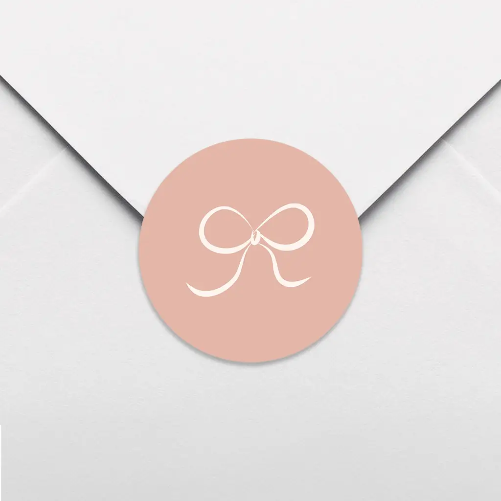 Een lieve sluitsticker met roze achtergrond. Op de sticker zie een lijntekening van een strikje. Pas het ontwerp naar wens aan in onze online editor.