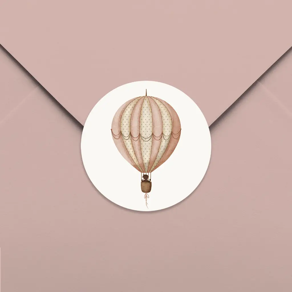 Schattige sluitsticker met roze luchtballon. In de luchtballon staat een lief silhouetje van een meisje. Pas de sticker naar wens aan in onze editor en maak jouw geboorteaankondiging compleet. De sluitstickers hebben een diameter van 35 mm en worden geleverd op vellen van 25 stuks.