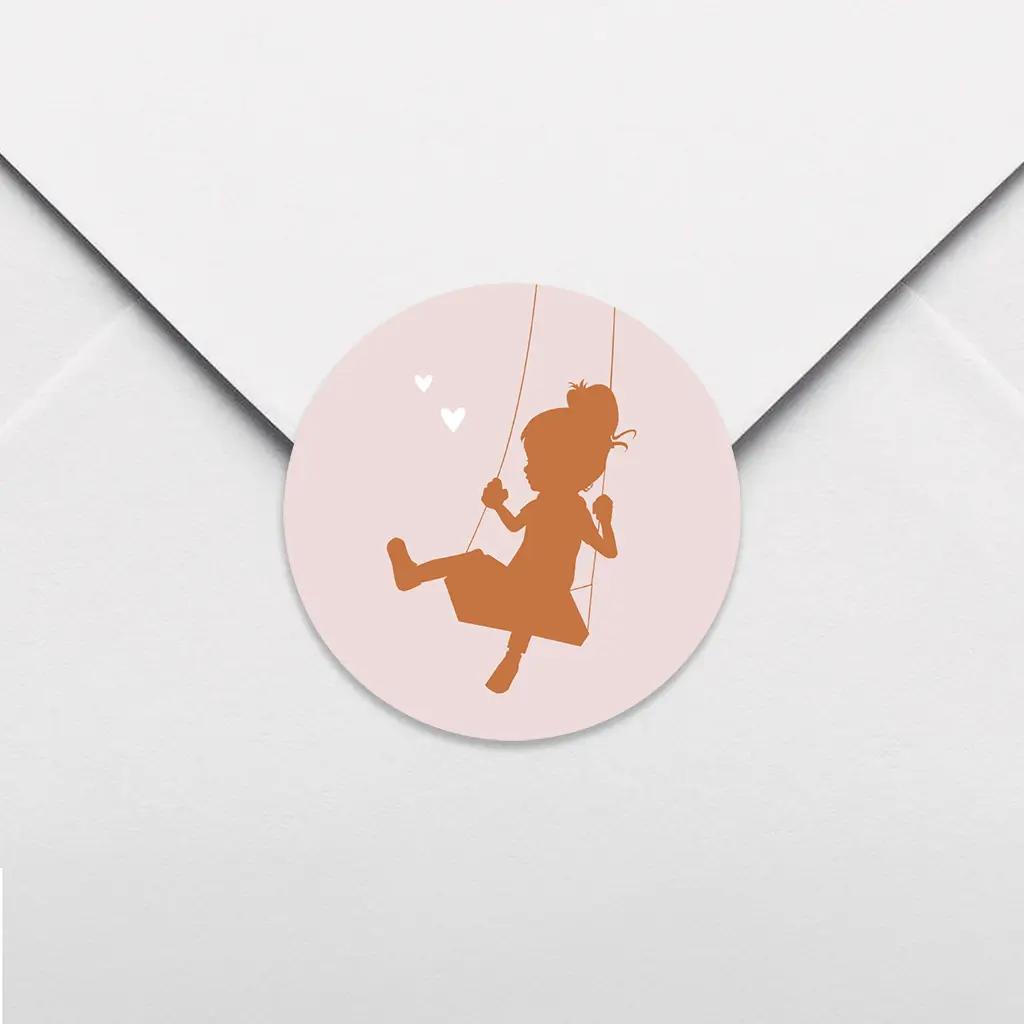 Een schattige sluitsticker voor op de envelop van jouw geboorteaankondiging. De sticker past perfect bij het geboortekaartje van designer Blijkaartje. Op de sticker zie je een meisje op een schommel. Pas de sticker naar wens aan.