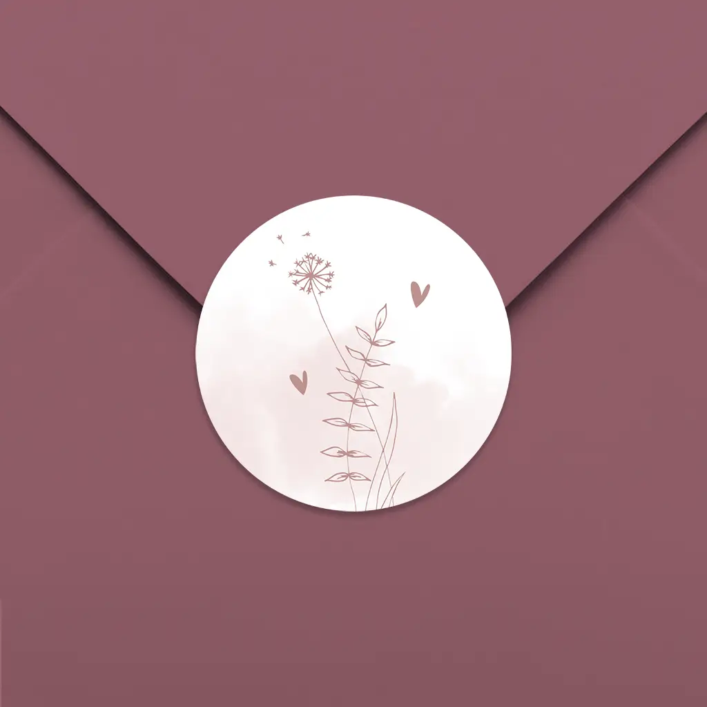Een stijlvolle sluitsticker passend bij het geboortekaartje van jouw kindje. De sticker heeft een roze watercolour achtergrond met daarop verschillende takjes en hartjes. Pas de sticker naar wens aan in onze online editor. De sluitstickers hebben een diameter van 35 mm en worden geleverd op vellen van 25 stuks.