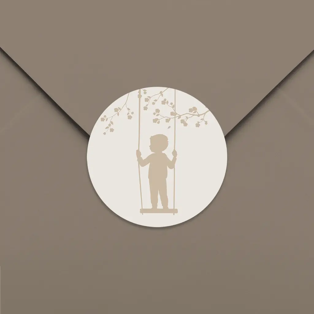 Een stijlvolle sluitsticker met silhouetje van jouw zoontje. Het silhouetje staat op een schommel aan een boom en past perfect bij het geboortekaartje van designer Blijkaartje. Pas de sticker naar wens aan in onze online editor. De sluitstickers hebben een diameter van 35 mm en worden geleverd op vellen van 25 stuks.