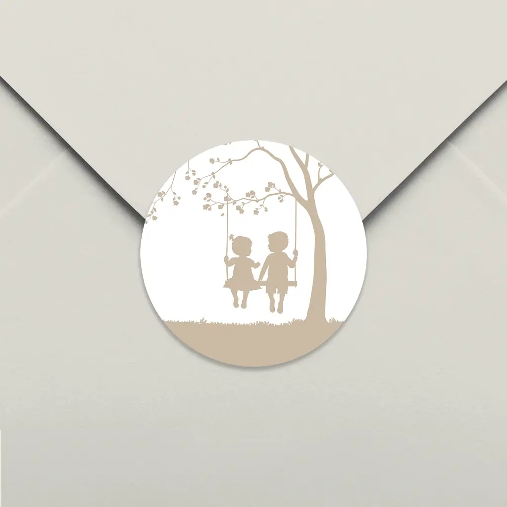 Het verzenden van de geboortekaartjes wordt een feestje met deze sluitsticker. Op de sluitsticker zijn de silhouetjes van een grote broer met zijn kleine zusje op schommel te zien. De sluitsticker kan helemaal naar wens aangepast worden in onze online editor.