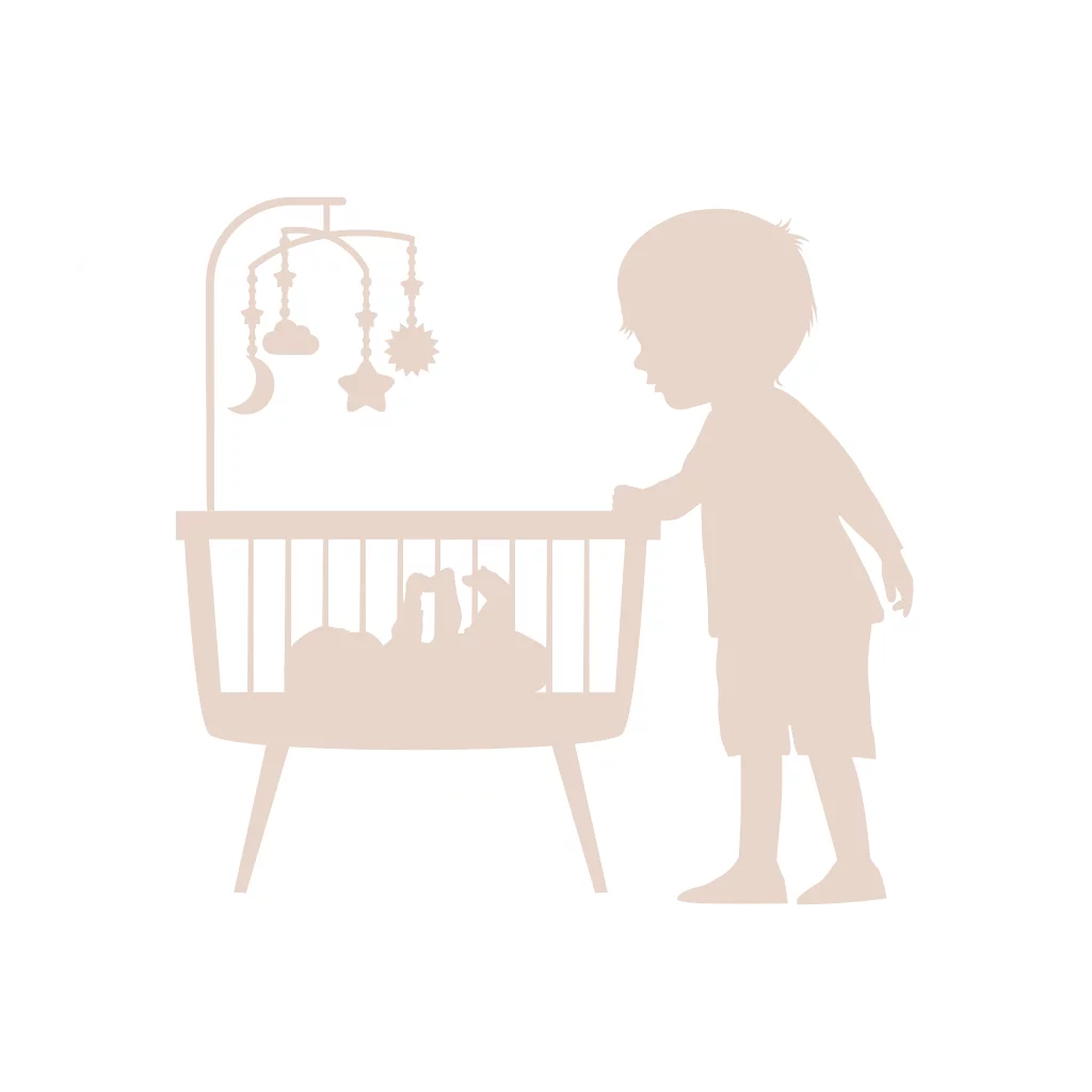 Een lieve sluitsticker met een grote broer die staat bij het wiegje van haar zusje. De sticker is bijpassend bij het geboortekaartje van onze designer Blijkaartje.