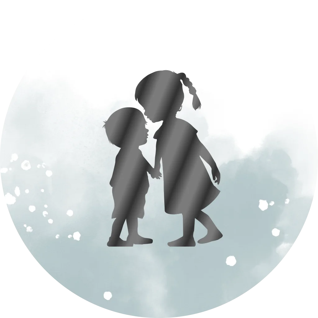 Schattige sluitsticker met het zwarte silhouet van een grote zus hand in hand met haar kleine broertje. De achtergrond is in lichtblauwe watercolour met verfspetters.