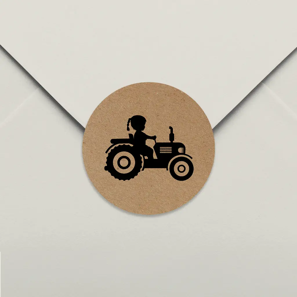 Stoere sluitstickers in kraftlook in hetzelfde boerderijthema als het geboortekaartje: in het midden het silhouet van een meisje op een trekker. De sluitstickers hebben een diameter van 35 mm en worden geleverd op vellen van 25 stuks.