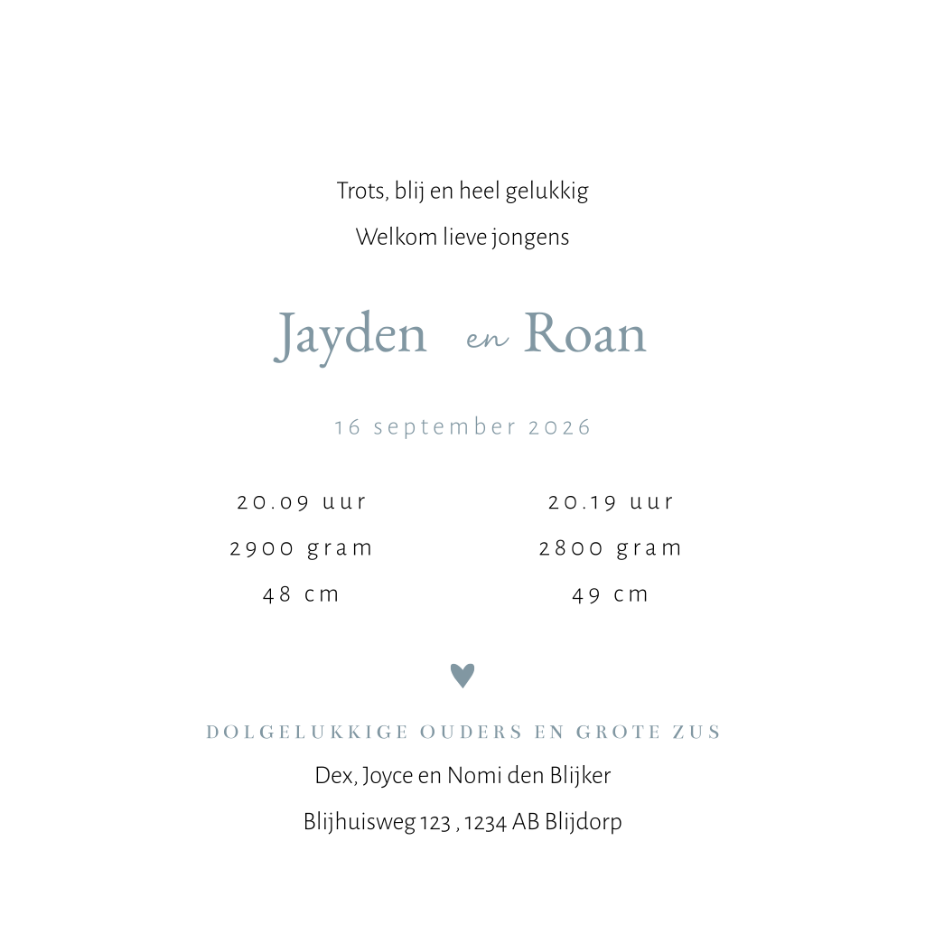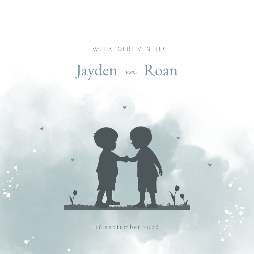 Dit lieve geboortekaartje is perfect om de geboorte van jullie jongenstweeling mee aan te kondigen. Op het kaartje staat een lief silhouetje van twee broertjes die elkaars handje vasthouden. Daar omheen zijn hartjes en bloemetjes afgebeeld die het kaartje een lieve uitstraling geven. De achtergrond van het kaartje is van blauw watercolour. Pas de namen van jullie tweeling makkelijk aan in onze online editor, bestel een proefdrukje en bekijk je ontwerp thuis!