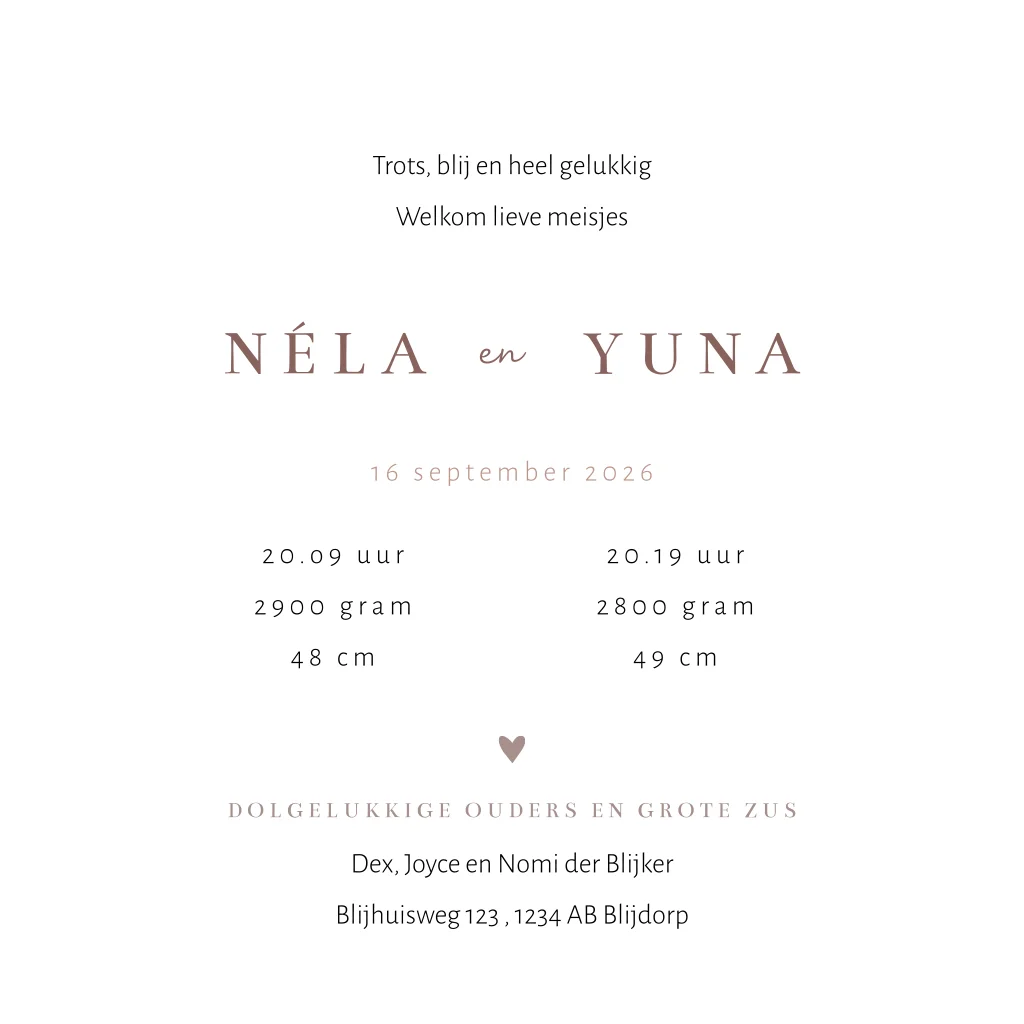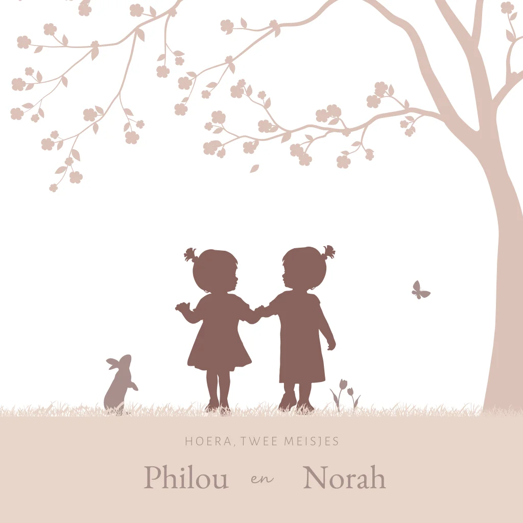 Lief geboortekaartje in lente thema voor de geboorte van jullie tweeling. Het geboortekaartje voor jullie dochters is verrijkt met een illustratie van een konijntje en vlindertje. Het kaartje heeft poederroze kleuren en kan je zelf aanpassen in onze editor.
