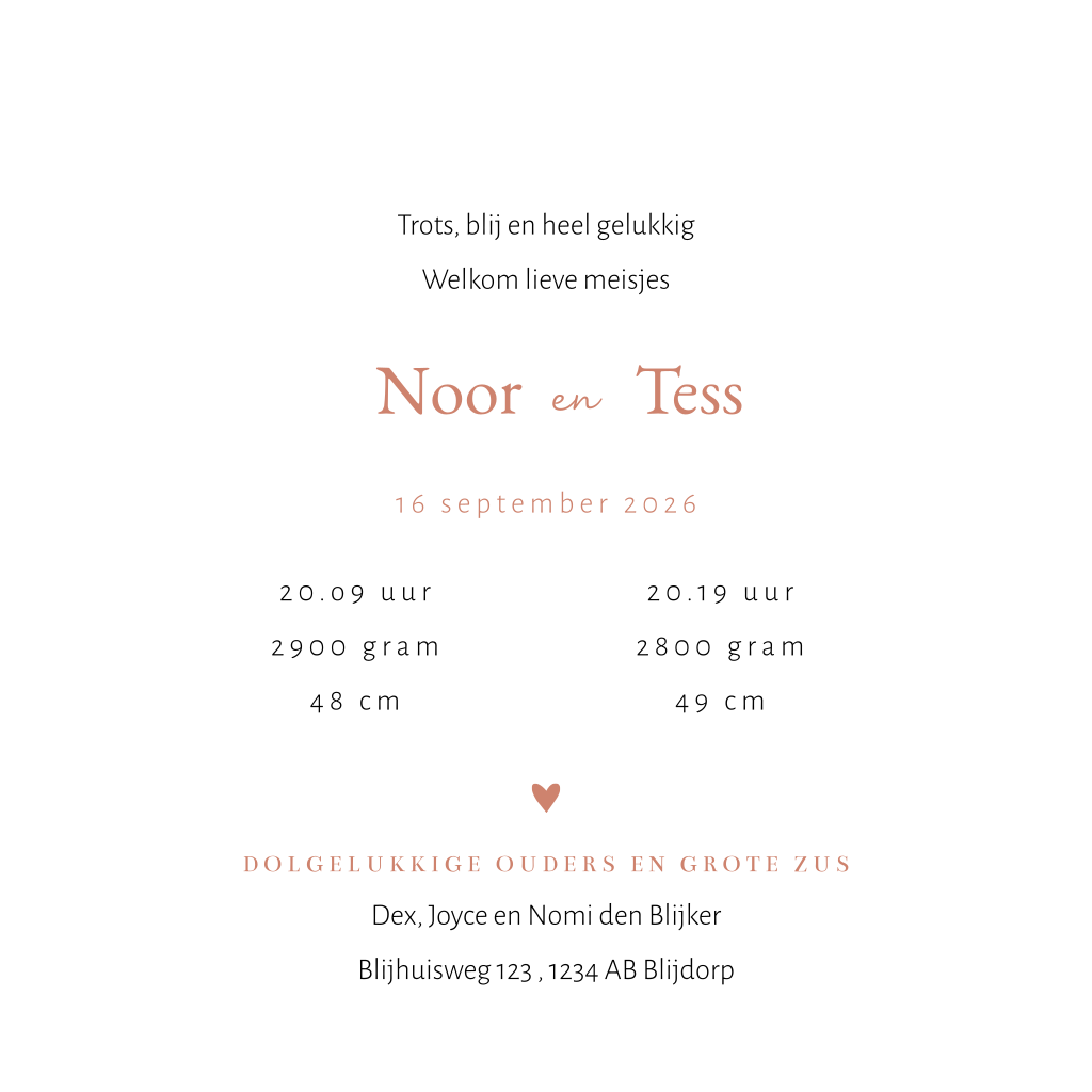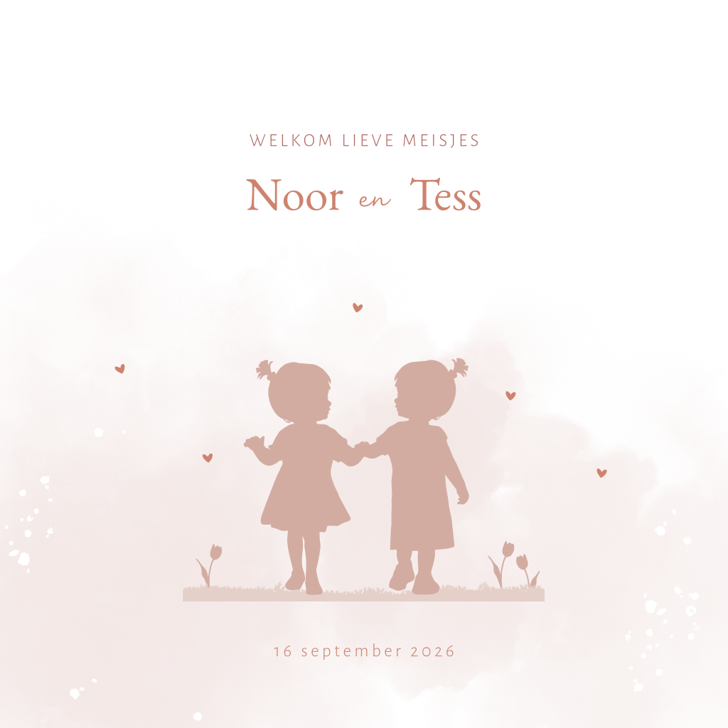 Lief geboortekaartje voor de geboorte van jullie meisjestweeling. Het kaartje heeft een mooi silhouet van de twee zusjes die elkaars handje vasthouden met daar omheen vrolijke hartjes en bloemetjes. De kaart heeft een roze watercolour achtergrond. Pas het geboortekaartje makkelijk en snel aan in onze editor, bestel een proefdrukje en bekijk het kaartje thuis!