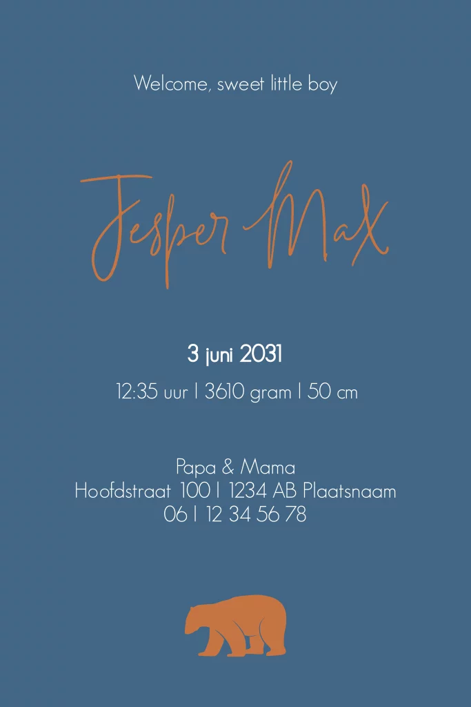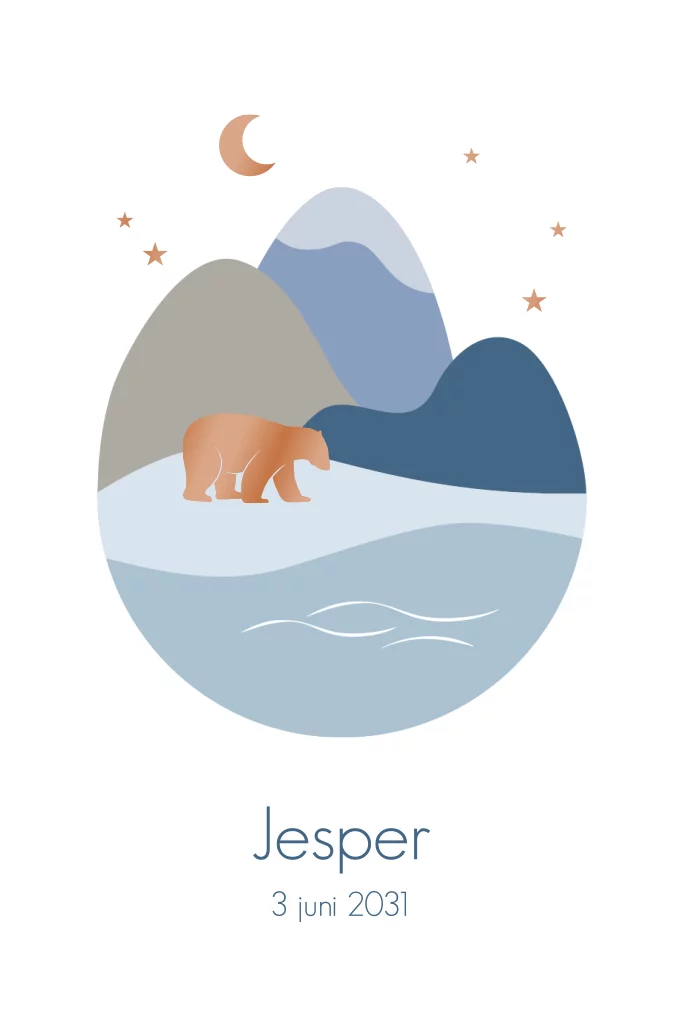 Dit is een luxe kaartje voor de geboorte van jullie zoon. Centraal op het kaartje is een abstract landschap te zien. De ijsbeer, maan en sterren worden gedrukt in hoogglans. Pas het kaartje naar wens aan in onze online editor!