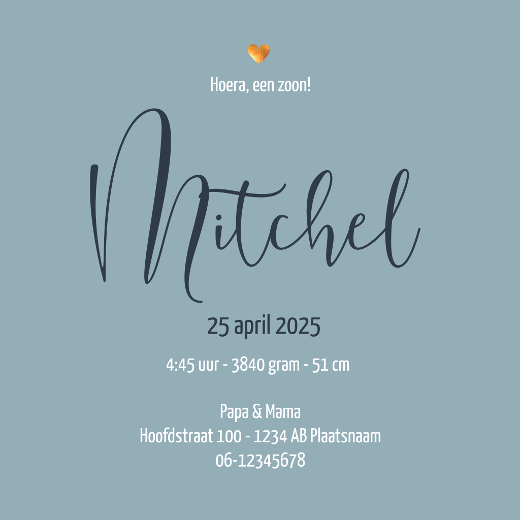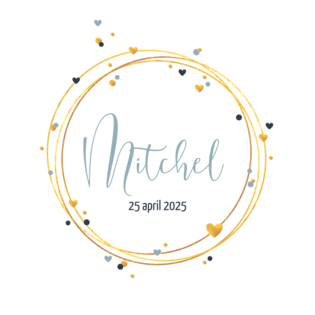 Wat een stijlvolle geboortekaart om de geboorte van je zoontje mee aan te kondigen! De naam kun je in de cirkels in goudlook zetten die is versierd met stippen en lieve hartjes.