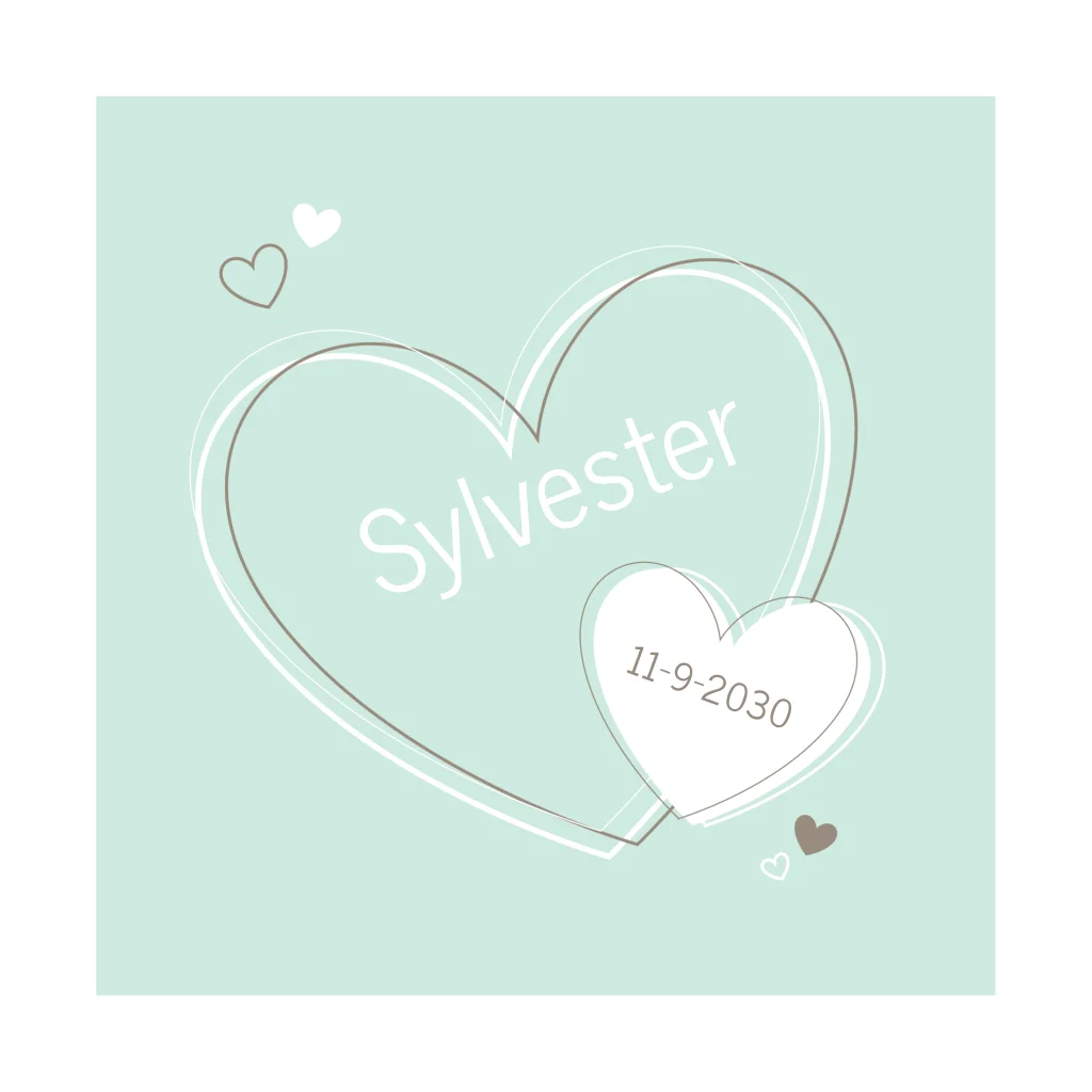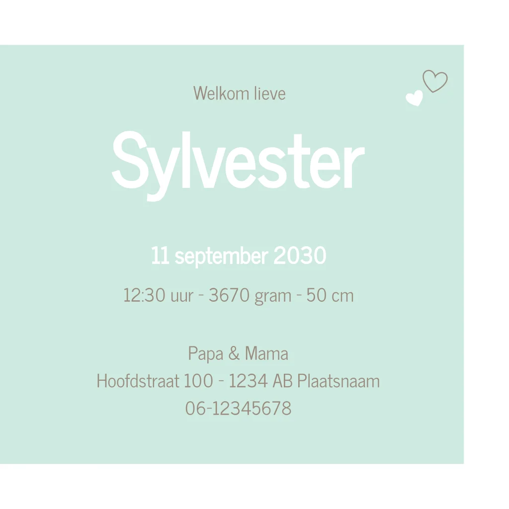 Lief geboortekaartje voor een jongen. Met een mintgroene achtergrond, witte rand en lieve hartjes. In het witte hart kun je de geboortedatum zetten. Maak hem zelf af voor jouw kleintje!