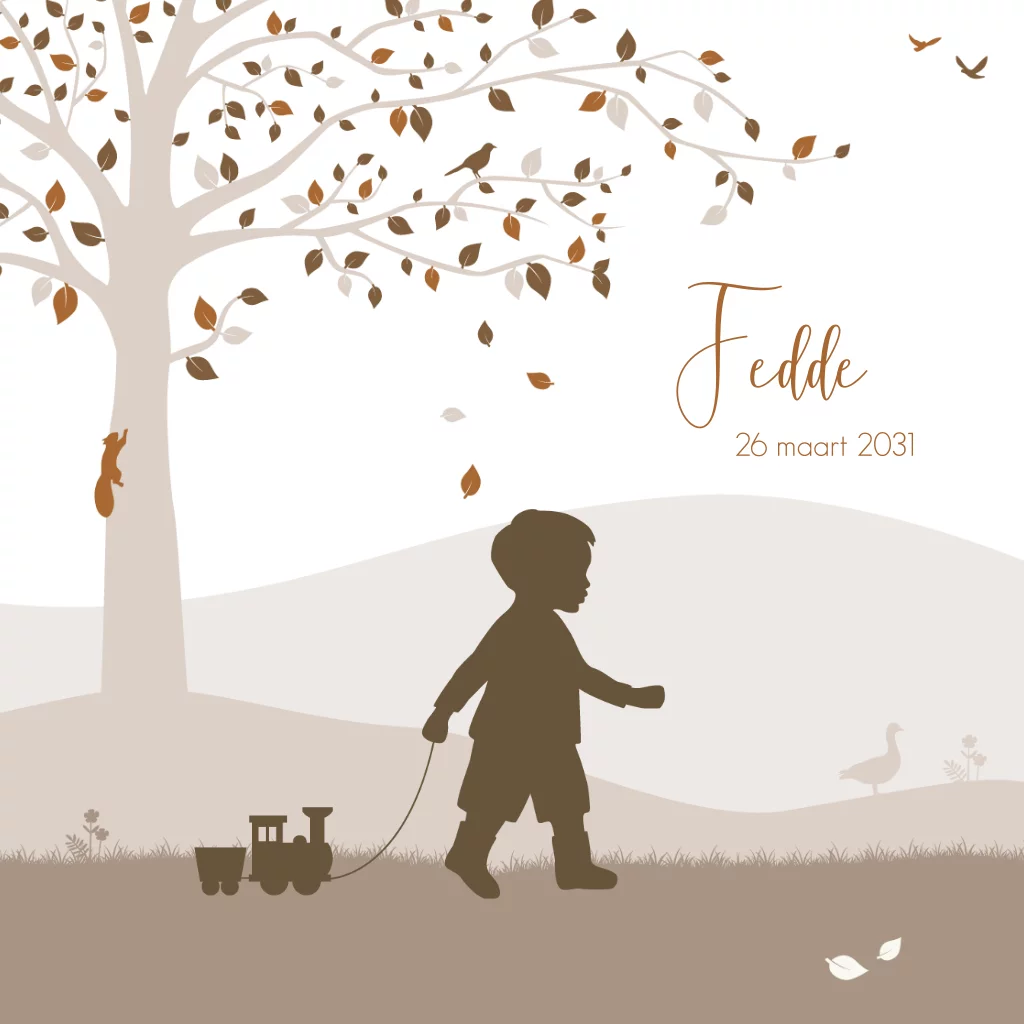 Lief geboortekaartje met silhouet van jongen in herfstig landschap