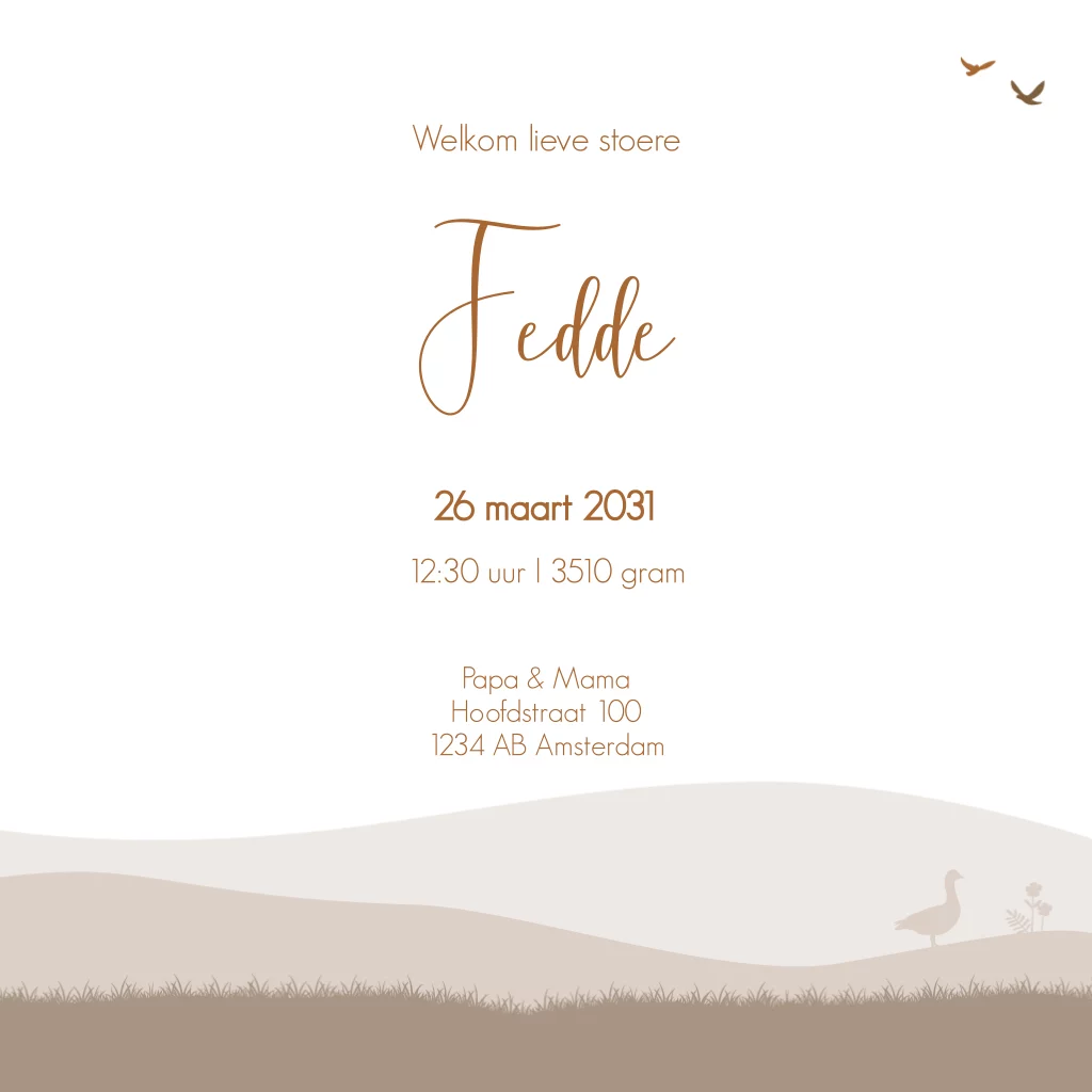 Dit is een mooi geboortekaartje voor jullie zoon. Op het kaartje is het silhouetje van een jongen in herfstachtig landschap te zien. Het kaartje kan helemaal naar wens aangepast worden in onze online editor.