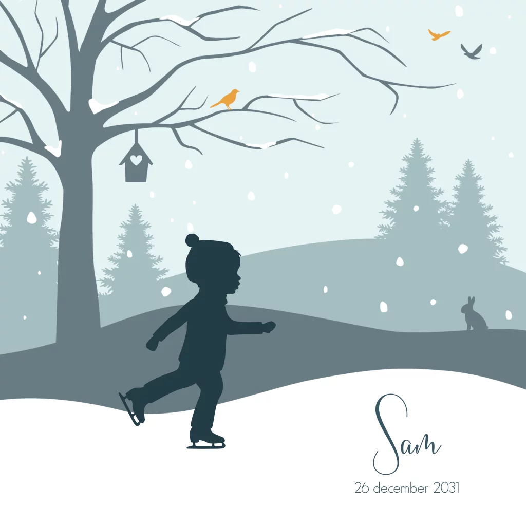 Winters geboortekaartje met silhouet van een schaatsende jongen