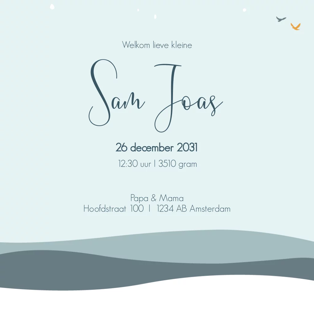 Kondig de geboorte van jullie zoon aan met dit lieve kaartje. In een winters landschap is een jongen aan het schaatsen. Het kaartje kan helemaal naar wens aangepast worden in onze online editor.