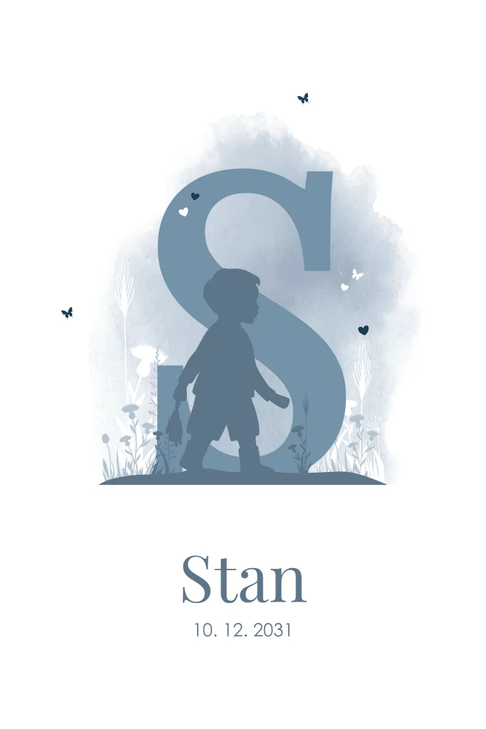 Kondig de geboorte van je zoon aan met dit stoere kaartje. Op een blauwe watercolour achtergrond is het silhouet van een jongen te zien. De grote initiaal geeft dit kaartje een stoere uitstraling. Het kaartje kan helemaal naar wens aangepast worden in onze online editor.