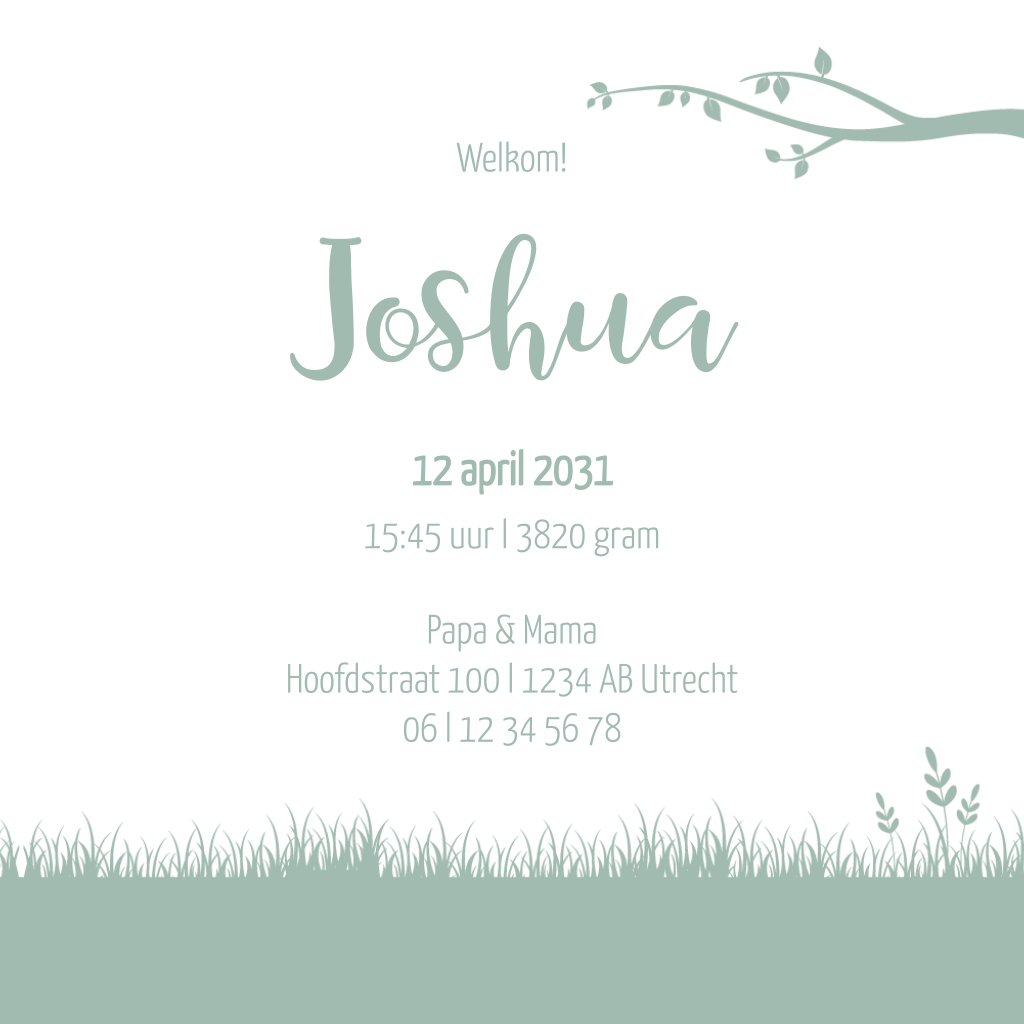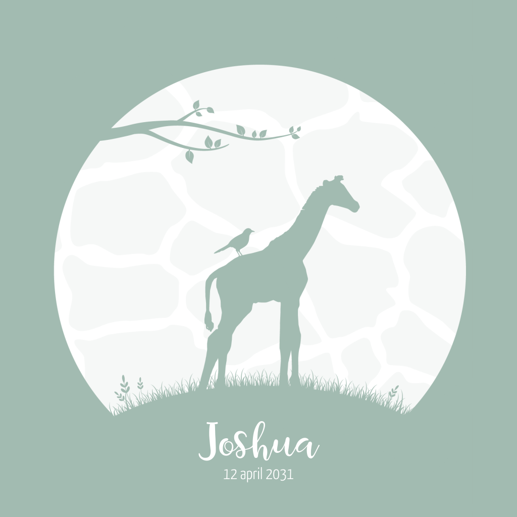 Lief geboortekaartje voor een jongen. Met silhouet van een giraffe en vogel in het maanlicht. Dit prachtige kaartje is gekleurd in mintgroen en wit.