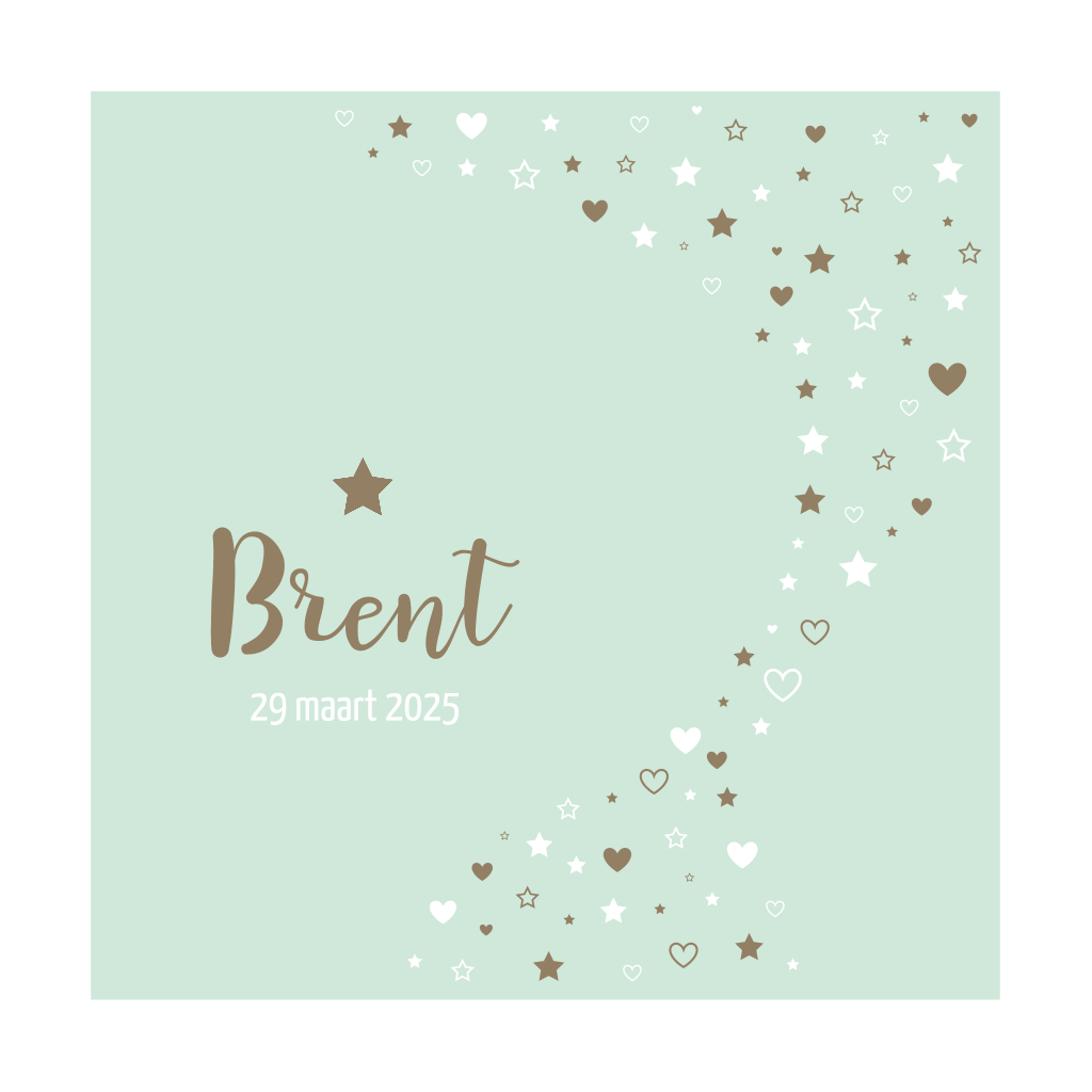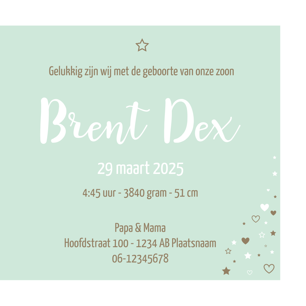 Een leuke geboortekaart voor een jongen. Het lijkt net alsof de kaart een bewegende golf aan sterretjes en hartjes heeft, wat een leuk effect geeft!