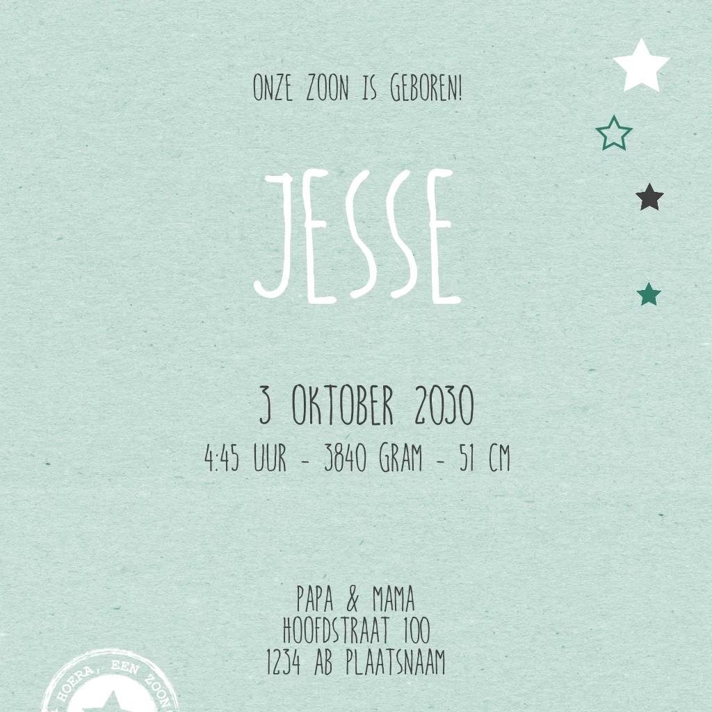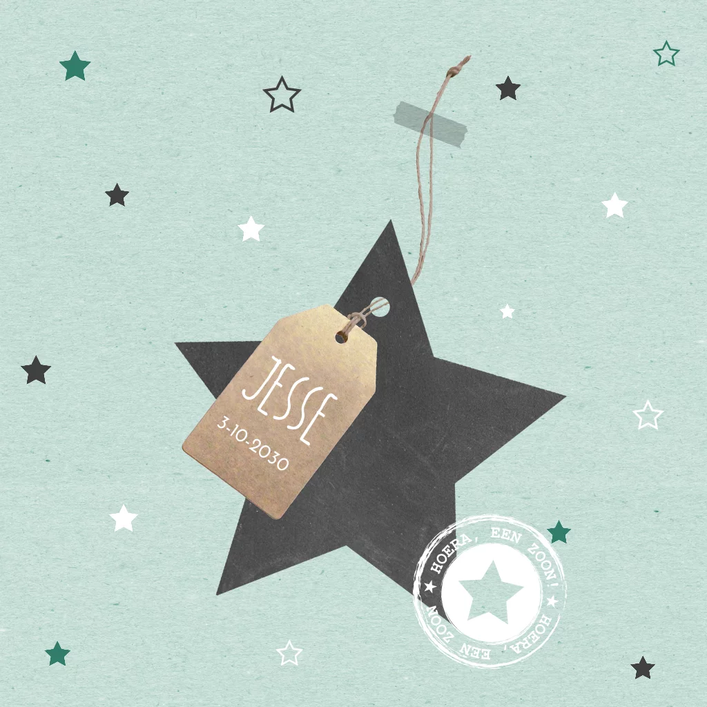 Trendy geboortekaartje voor een jongen met grote ster, label, stempel en kleine sterretjes in groen, wit en grijs.