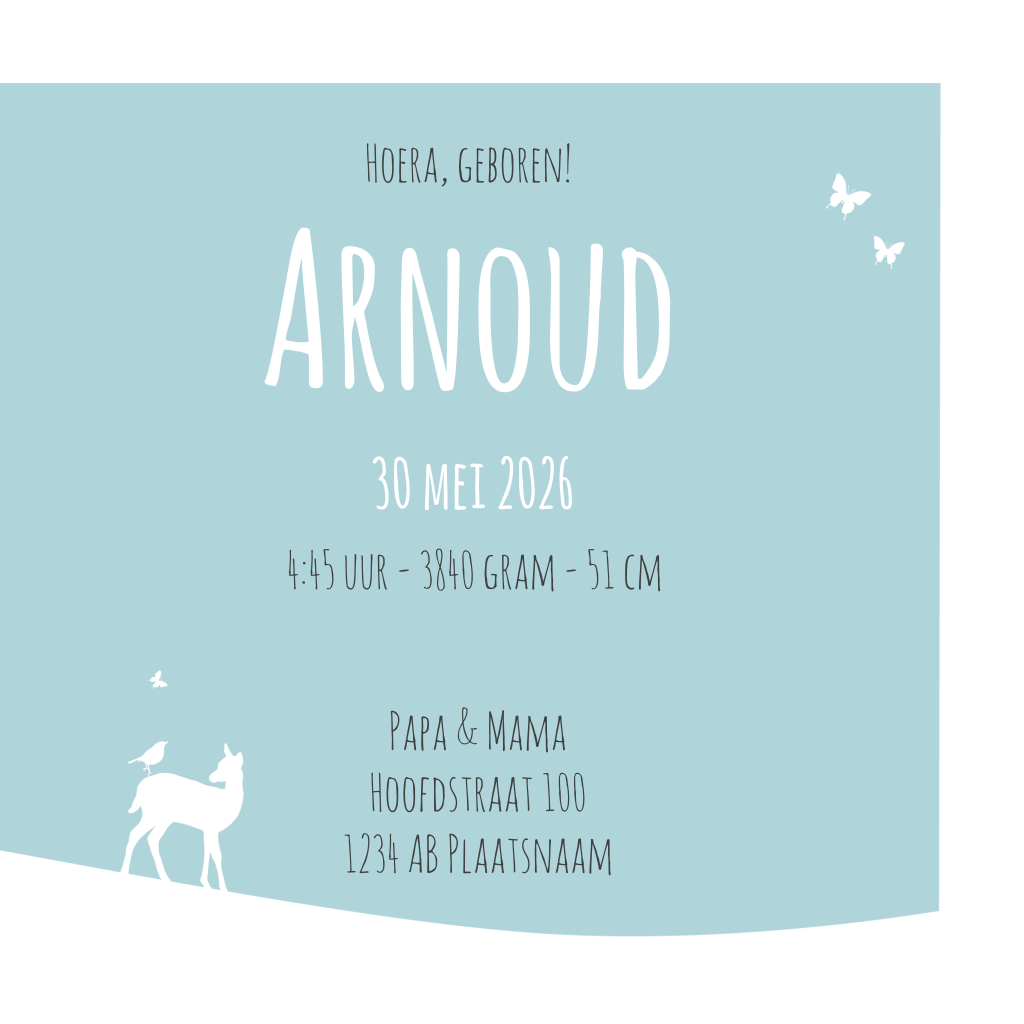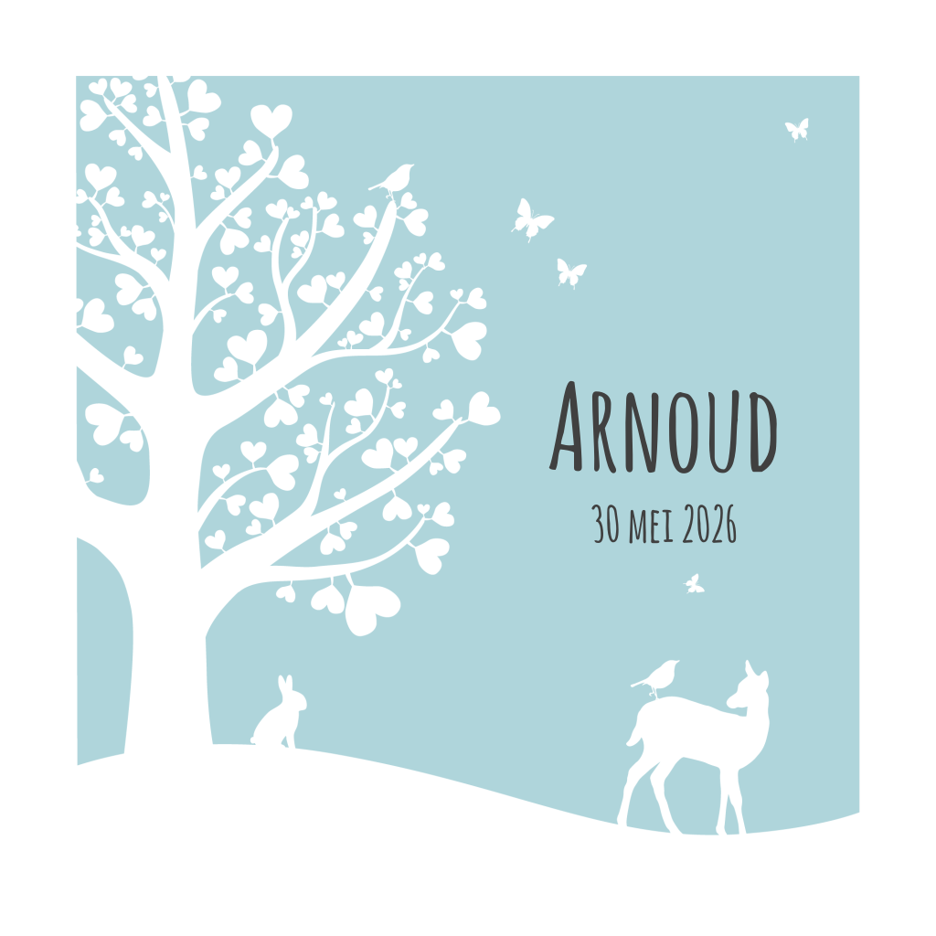 Lief silhouet geboortekaartje met hartjes boom, vogeltjes, vlinders, hertje en konijntje. Voor een jongen! De achtergrondkleur pas je zelf gemakkelijk aan, rechts in het menu.
