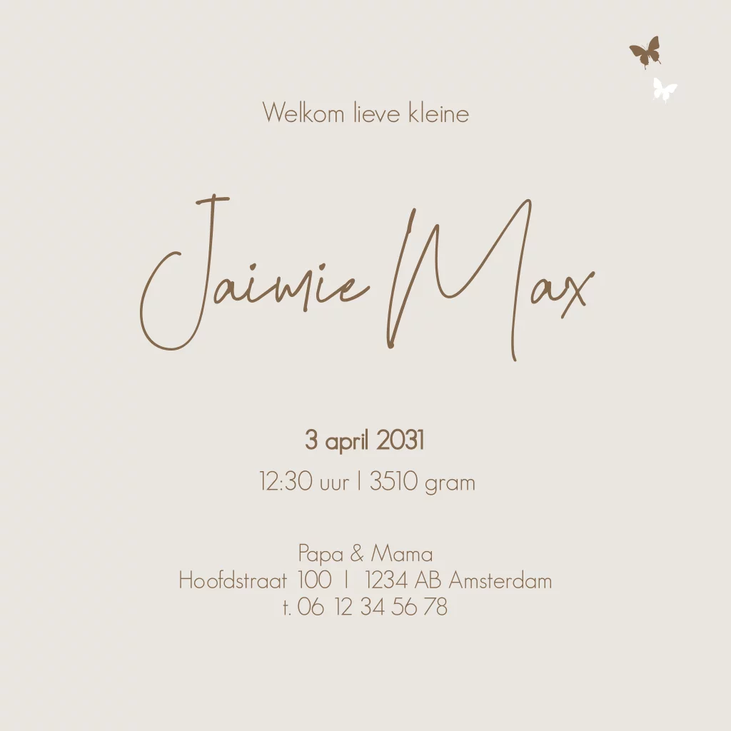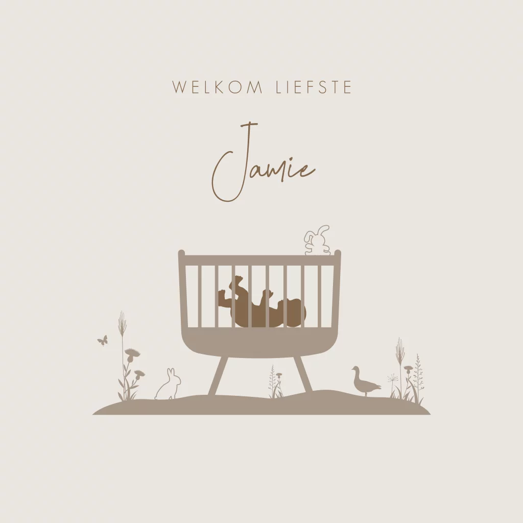 Een lief geboortekaartje voor jouw kindje. Het kaartje heeft een beige achtergrond met daarop een silhouetje van een baby in wiegje. Het wiegje staat tussen de bloemen in het gras. Pas het ontwerp naar wens zelf aan.