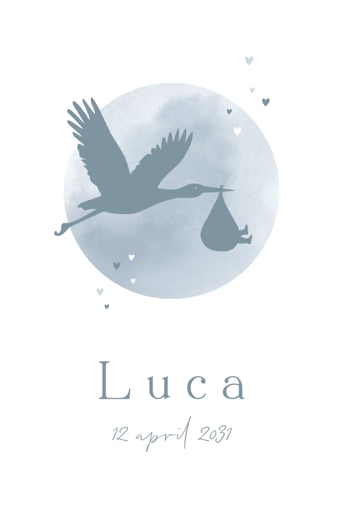 Een staand geboortekaartje voor jouw kindje. Het kaartje heeft een witte basis met blauwe elementen. Zo zie je een silhouet van een ooievaar en baby. Pas het ontwerp naar wens aan in onze online editor.