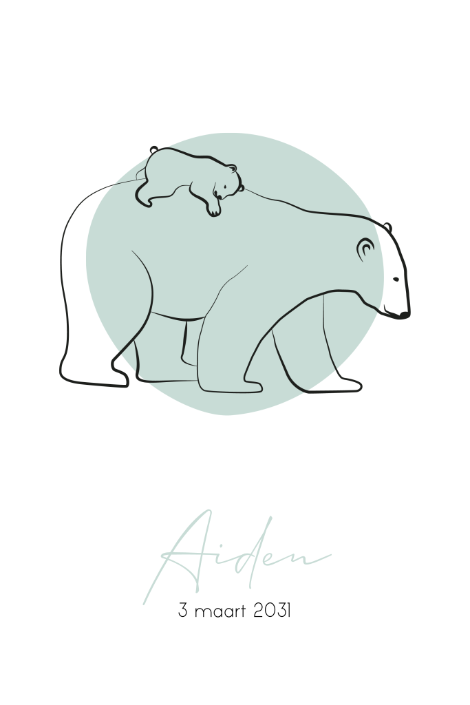 Kondig de geboorte van jullie zoontje aan met dit lieve kaartje. Centraal op het kaartje staat een blauw vlak met de lijntekening van twee beren. Pas het kaartje naar wens aan in onze online editor en bestel snel een proefdruk om dit kaartje in het echt te zien!