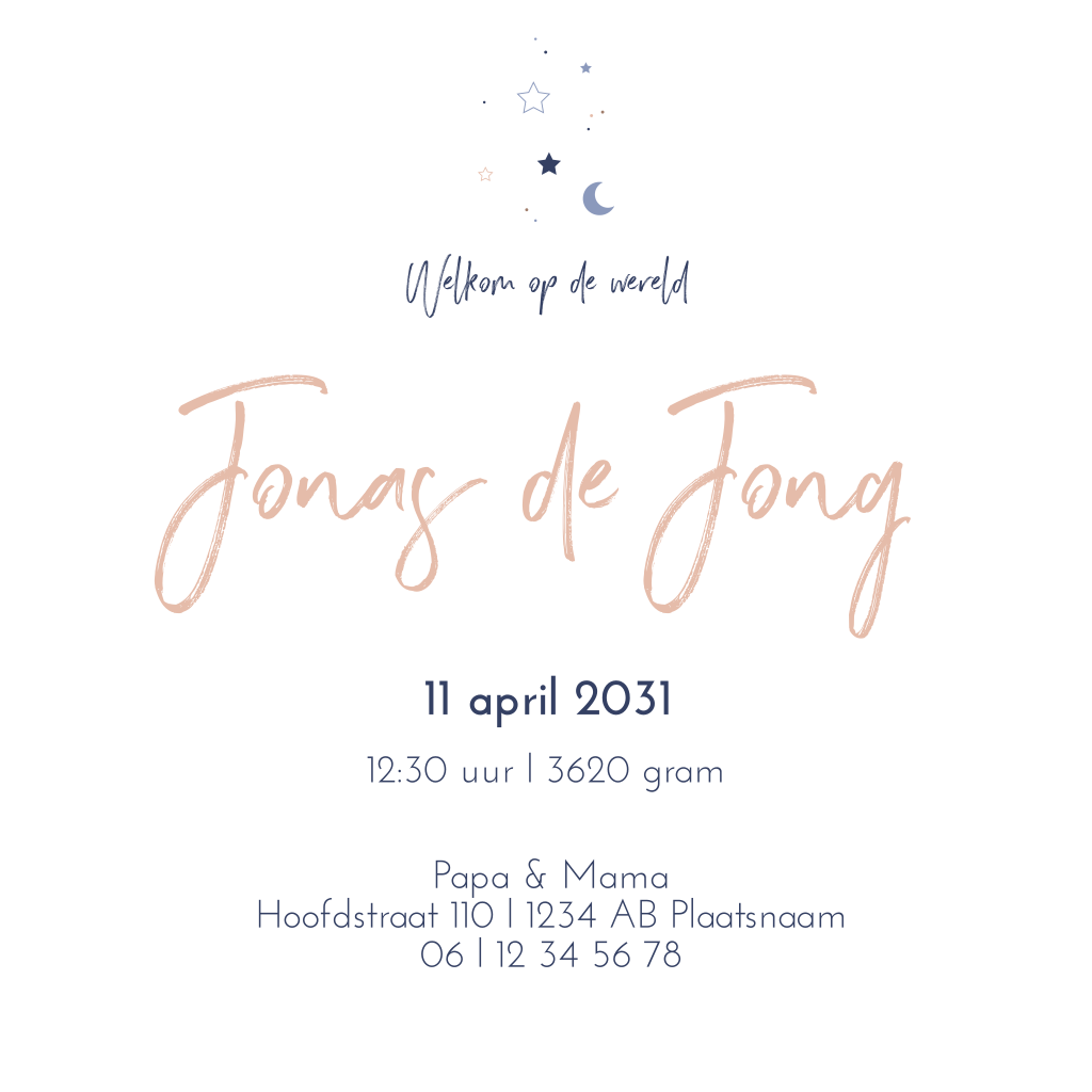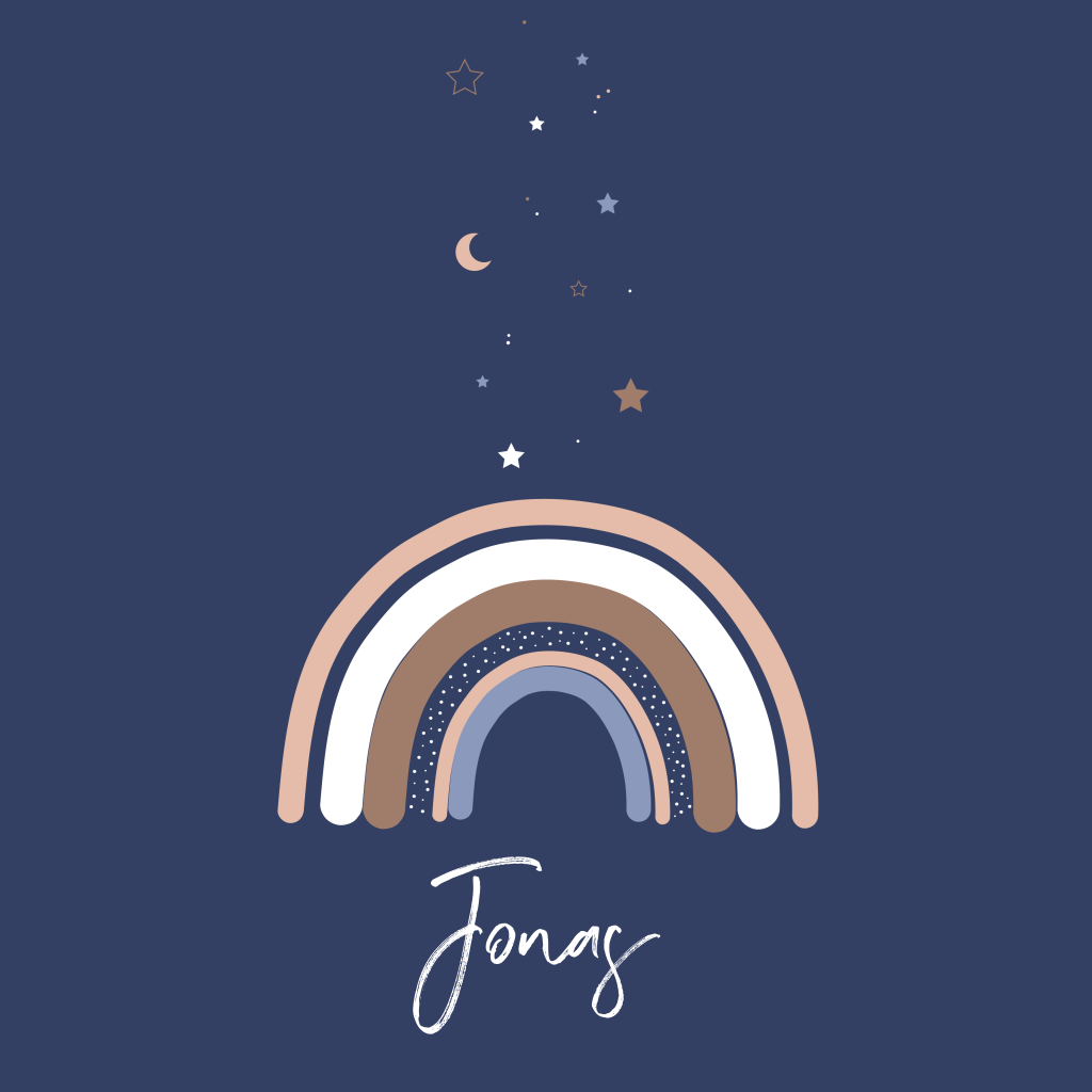 Hippe geboortekaart voor je zoontje met een hippe illustratie van een regenboog met sterretjes en een maantje op een donkerblauwe achtergrond.