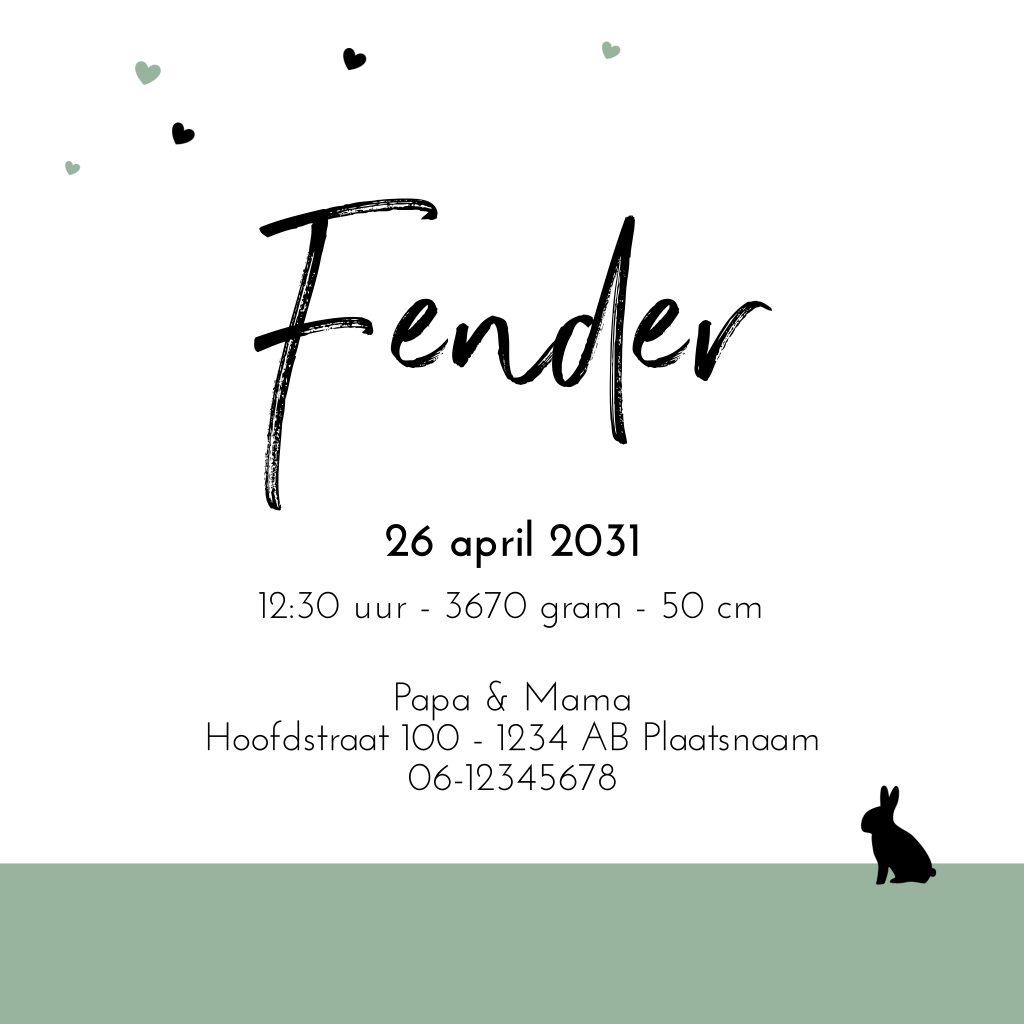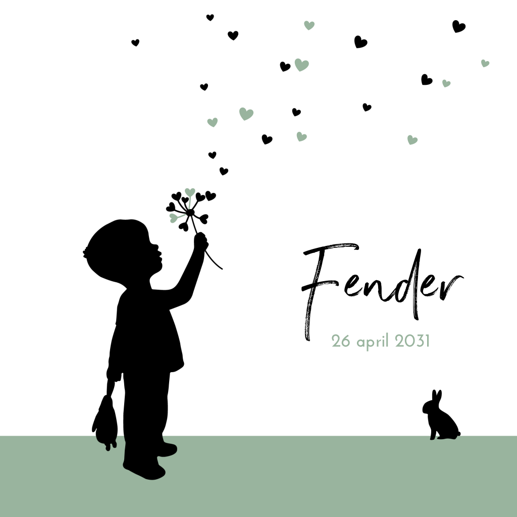 Stijlvol geboortekaartje voor je pasgeboren zoontje met een hip silhouet van een jongen die een paardebloem met hartjes uitblaast en een konijntje. Pas de kleuren en lettertypes aan naar je eigen smaak en maak zo je eigen kaart!