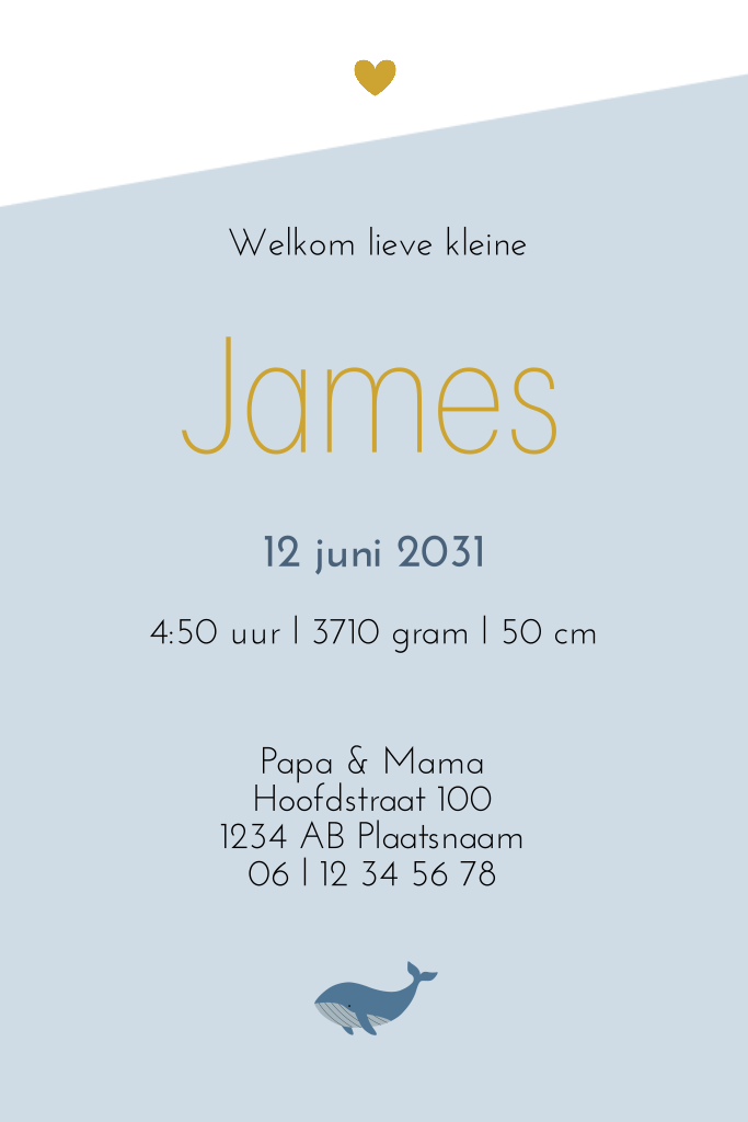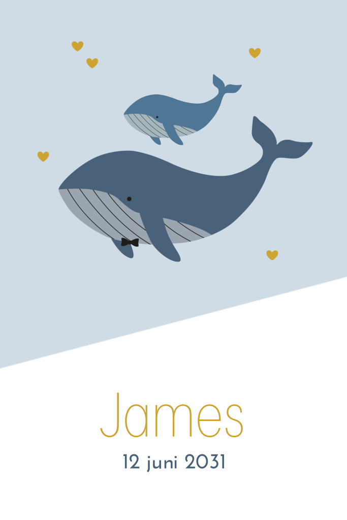 Stoere geboortekaart voor de geboorte van je zoon. Met hippe walvisjes op blauw met okergele hartje. Echt een leuk detail: de vader/moeder walvis draagt een hip strikje.