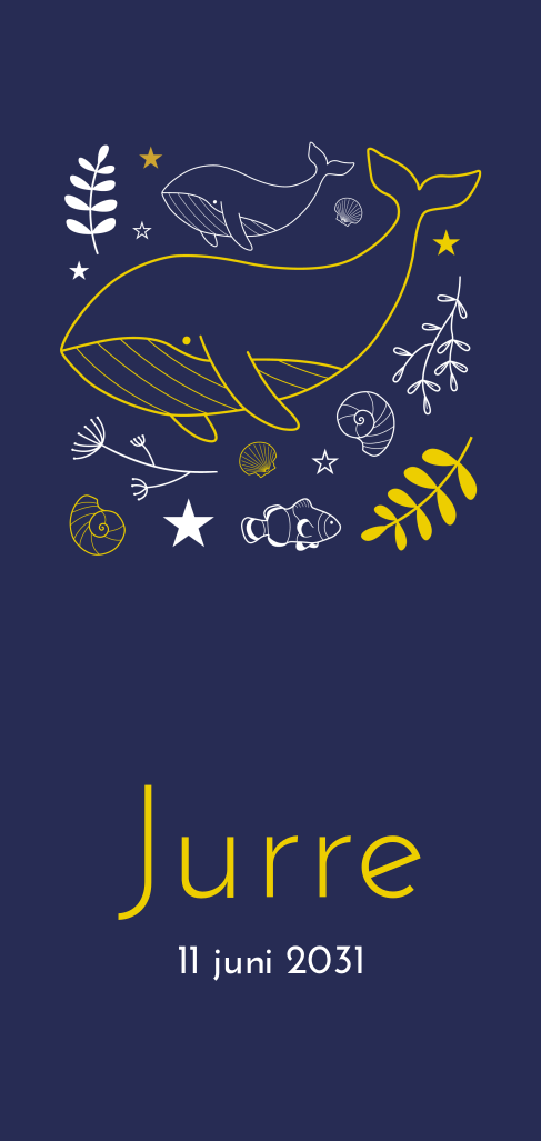Trendy geboortekaartje in waterdieren thema voor je pasgeboren zoon. Met hippe illustraties van walvissen, schepjes en zeewier op donkerblauw.