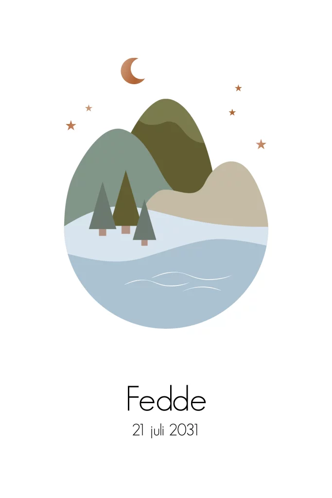 Geboortekaartje voor jongen met landschap en sterren in hoogglans