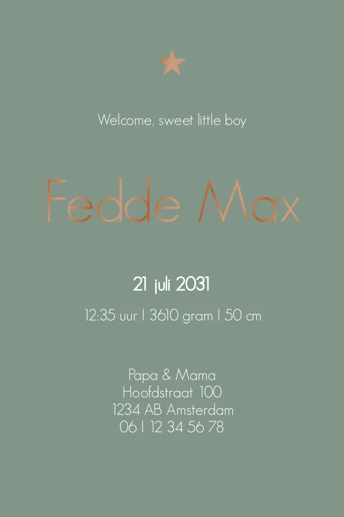 Avontuurlijk geboortekaartje voor de geboorte van een jongen. Het kaartje heeft een rustgevend landschap met organische vormen en de maan en sterren in hoogglans gedrukt. De binnenkant van het kaartje heeft een groene achtergrond en hier wordt de naam van jullie kleintje ook in hoogglans gedrukt. Pas het kaartje volledig aan naar je eigen wensen in onze online editor, bestel een proefdrukje en bekijk het kaartje thuis.