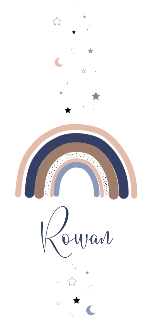 Hippe geboortekaart voor je pasgeboren zoon met een regenboog in blauw en natuurlijke tinten met sterretjes en een hip maantje.