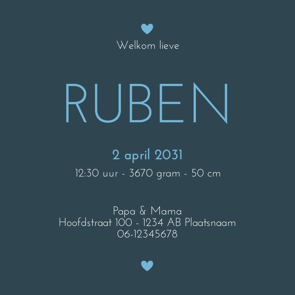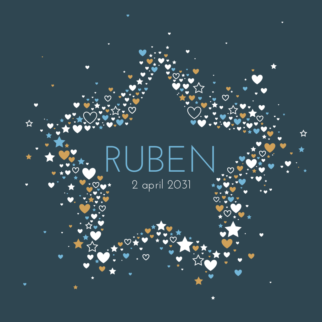 Ben je op zoek naar een hip geboortekaartje? Dan is deze kaart iets voor jou! Met allemaal kleine hartjes in wit, blauw en goudlook in de vorm van een grote ster. Schrijf daarin de naam van je zoon en maak je eigen kaartje!