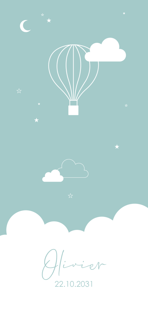 Kondig de geboorte van jullie zoontje aan met dit schattige kaartje. Op het kaartje zijn een luchtballon, wolkjes en sterretjes te zien tegen een blauwe achtergrond. Pas het kaartje aan in onze online editor en bestel een proefdruk om dit kaartje in het echt te zien!