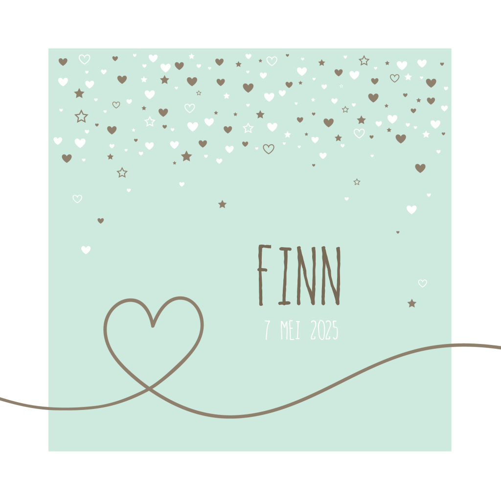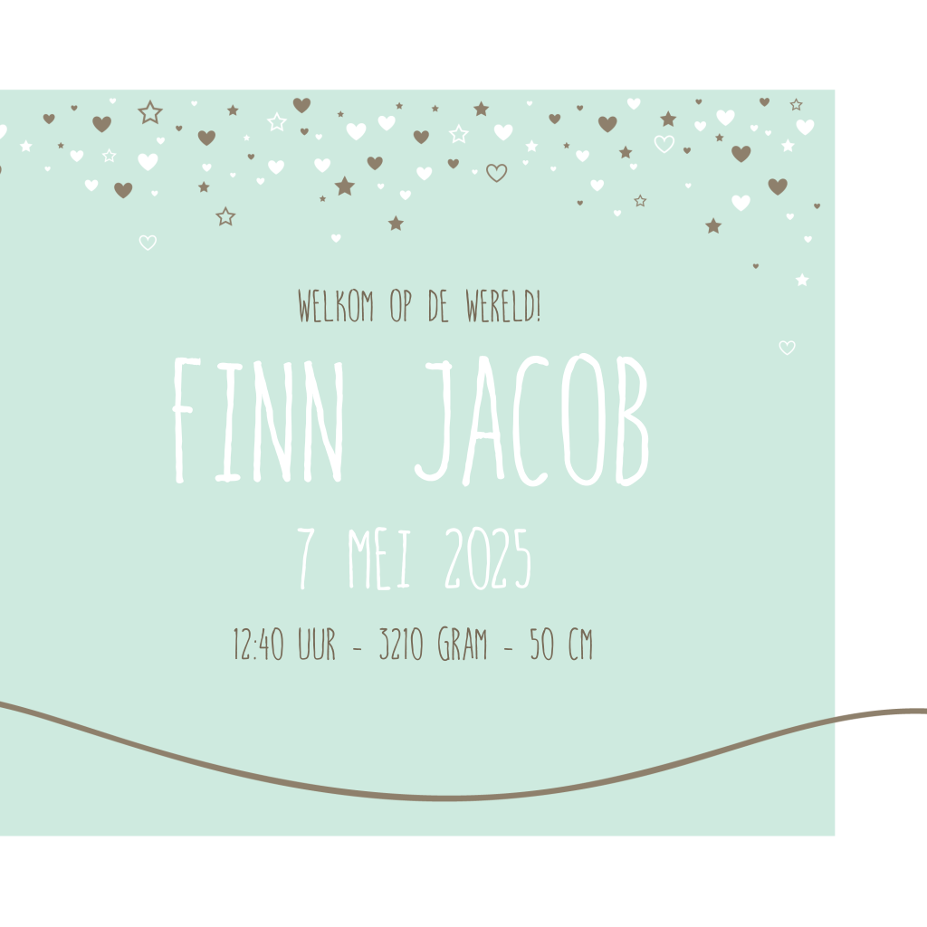 Hip geboortekaartje voor een jongen met veel hartjes en sterren. Onderaan een vrolijke lijn met hart erin. Pas de kleuren naar wens aan in de editor.