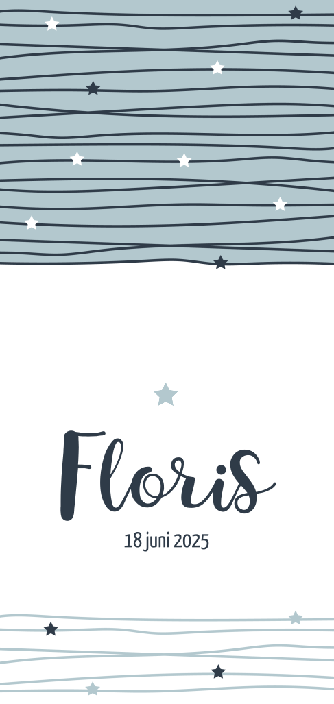Wat een hip babykaartje met nonchalant getekende strepen en kleine sterren! Het kleurvlak aan de bovenkant kun je de kleur geven die jij wilt. Leuk voor een kleine jongen!