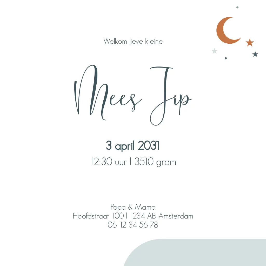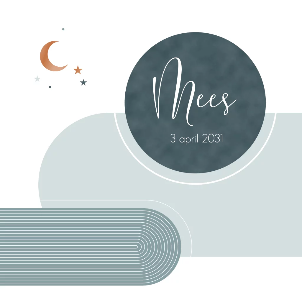 Vierkant geboortekaartje voor een jongen met vlakken, cirkels, lijnen, sterren en een maan in hoogglans. Het kaartje heeft verschillende blauwe tinten. Het geboortekaartje is naar wens aan te passen in onze online editor.