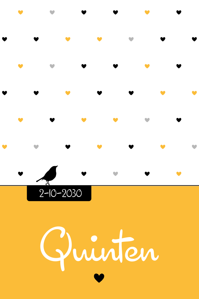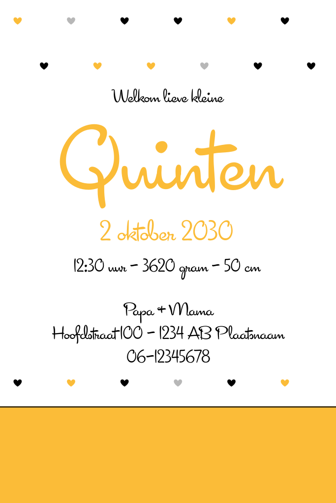 Stuur dit lieve kaartje als geboorteaankondiging van je zoon naar al je vrienden en familie. Met okergele hartjes en silhouet van vogeltje is dit kaartje echt lief en trendy!